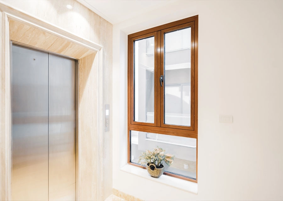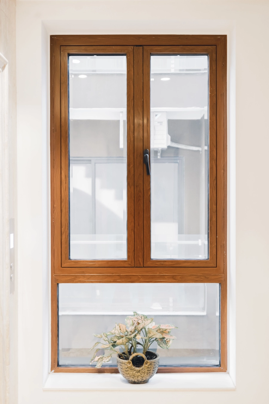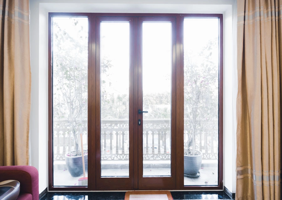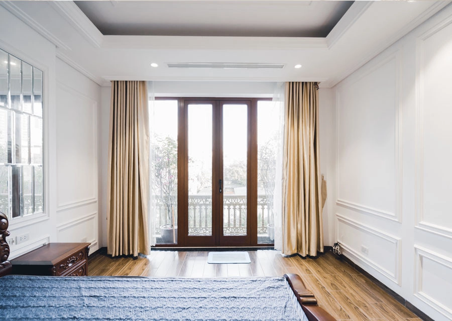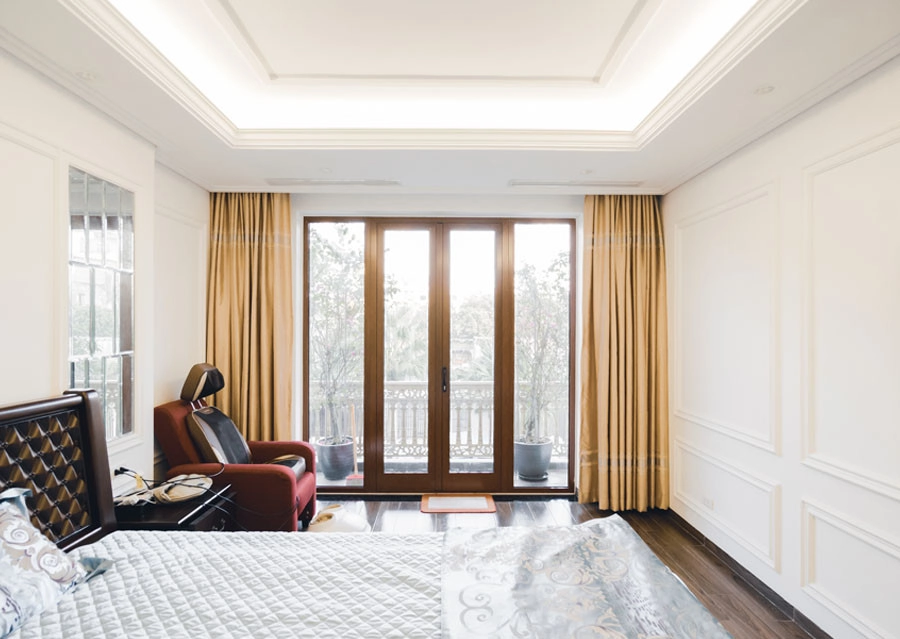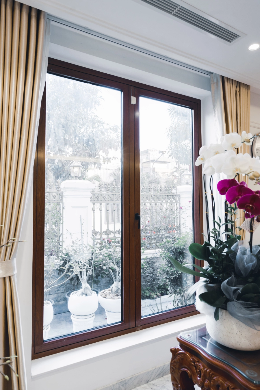 Biệt thự sử dụng cửa và vách kính Eurowindow hệ nhôm EA55 sơn màu vân gỗ, lắp kính hộp 2 lớp kính cường lực và phụ kiện đồng bộ của hãng Roto (CHLB Đức). Đây là hệ nhôm với thiết kế cánh bo tròn cải tiến, màu sơn vân gỗ giúp gia tăng tính thẩm mỹ, phù hợp với nội thất bên trong công trình. Không chỉ có tính cách âm, cách nhiệt tốt, cửa còn đón ánh sáng tự nhiên vào từng căn phòng, tạo tầm nhìn thoáng rộng ra cảnh quan xung quanh.