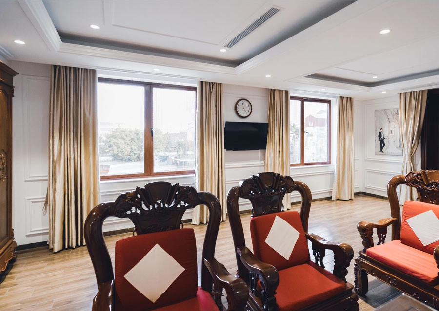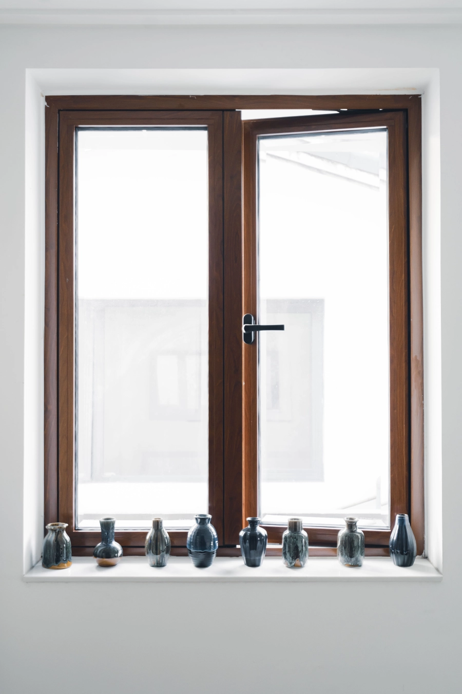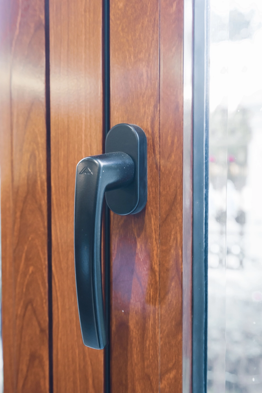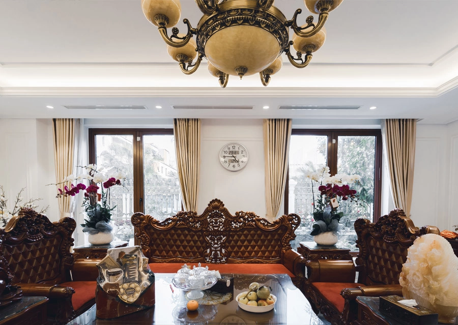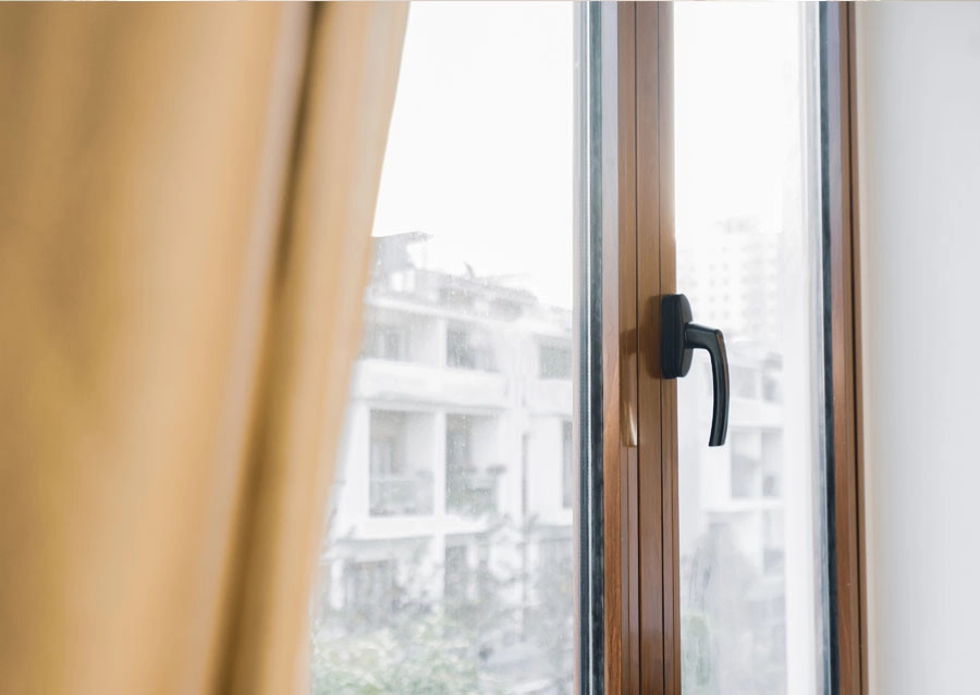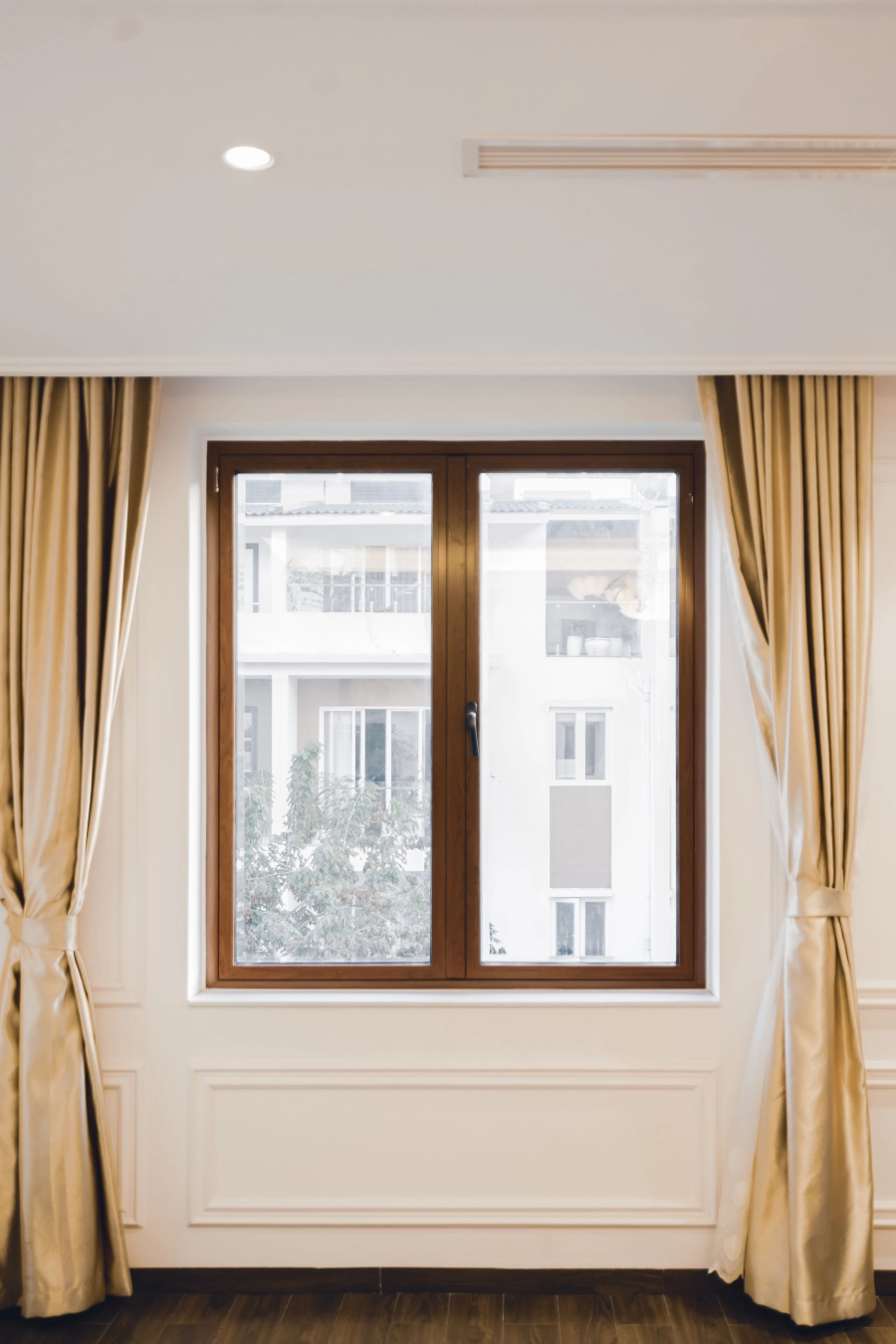 Biệt thự sử dụng cửa và vách kính Eurowindow hệ nhôm EA55 sơn màu vân gỗ, lắp kính hộp 2 lớp kính cường lực và phụ kiện đồng bộ của hãng Roto (CHLB Đức). Đây là hệ nhôm với thiết kế cánh bo tròn cải tiến, màu sơn vân gỗ giúp gia tăng tính thẩm mỹ, phù hợp với nội thất bên trong công trình. Không chỉ có tính cách âm, cách nhiệt tốt, cửa còn đón ánh sáng tự nhiên vào từng căn phòng, tạo tầm nhìn thoáng rộng ra cảnh quan xung quanh.