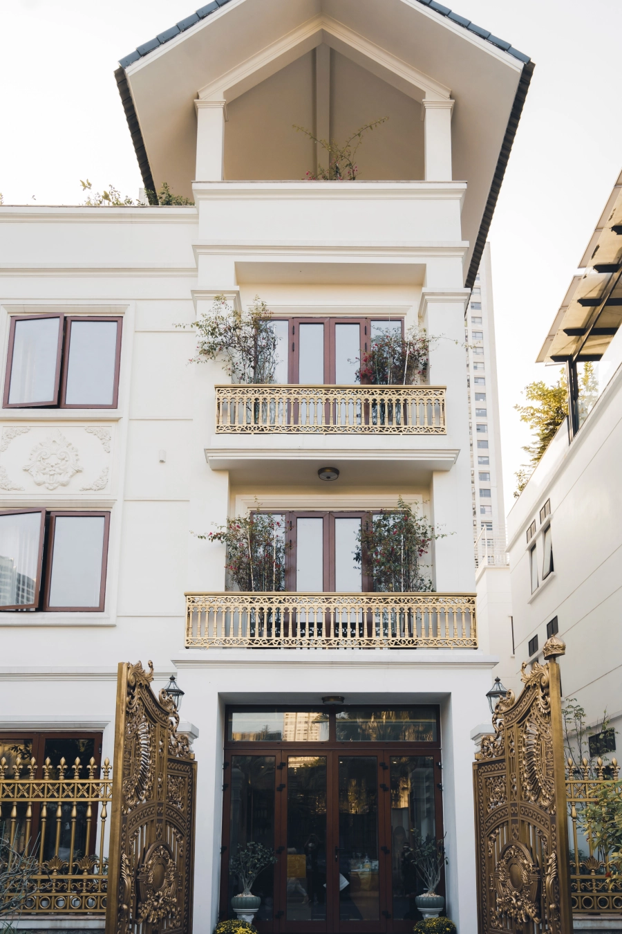 Mang phong cách hiện đại và sang trọng, căn biệt thự tại KĐT Green Pearl, Hà Nội nổi bật với gam màu trắng sữa chủ đạo. Sự kết hợp giữa màu vàng đồng của tường rào, cổng, lan can và màu vân gỗ của cửa tạo nên điểm nhấn nổi bật cho tổng thể công trình.