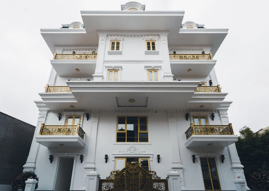 Căn biệt thự 3 tầng tại KĐT Phú Thịnh, Sơn Tây mang phong cách Tân cổ điển sang trọng, thanh lịch và hiện đại với gam màu trắng chủ đạo, chi tiết trạm trổ tinh xảo, phào chỉ tối giản và mái mansard đặc trưng.