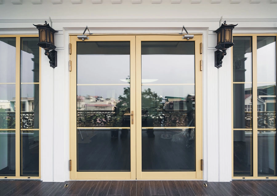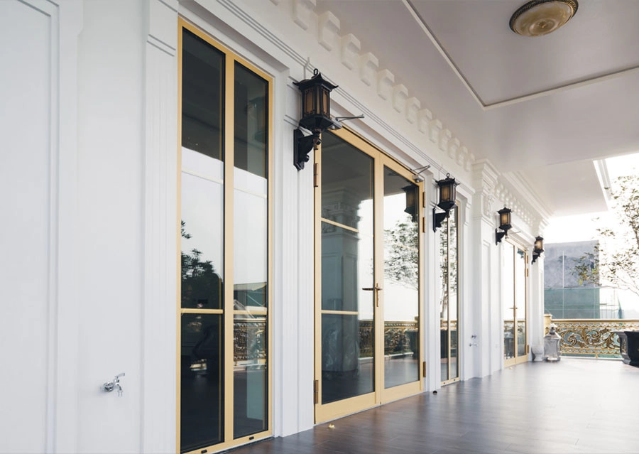 Công trình sử dụng cửa đi, cửa sổ và vách nhôm kính Eurowindow cùng phụ kiện nhập khẩu đồng bộ của hãng Cmech (Hoa Kỳ). Thanh profile nhôm và phụ kiện được sơn màu vàng đồng nổi bật tạo điểm nhấn ấn tượng trên nền tường trắng. Sản phẩm cửa và vách kính Eurowindow không chỉ tô điểm nét hoàng gia, tráng lệ cho diện mạo công trình mà còn tạo ra tầm nhìn thoáng đẹp từ nhiều vị trí trong dinh thự.