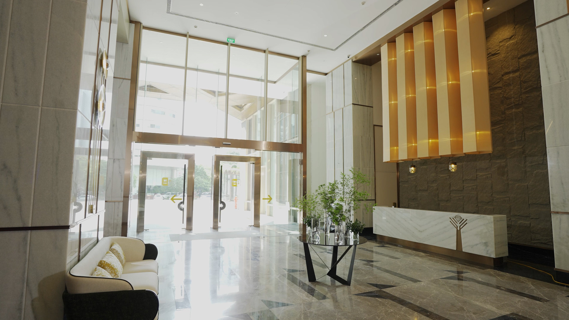 Thiết kế sảnh tòa nhà Epic Tower hiện đại, sang trọng nhờ vách kính chạm trần, cửa kích thước lớn.