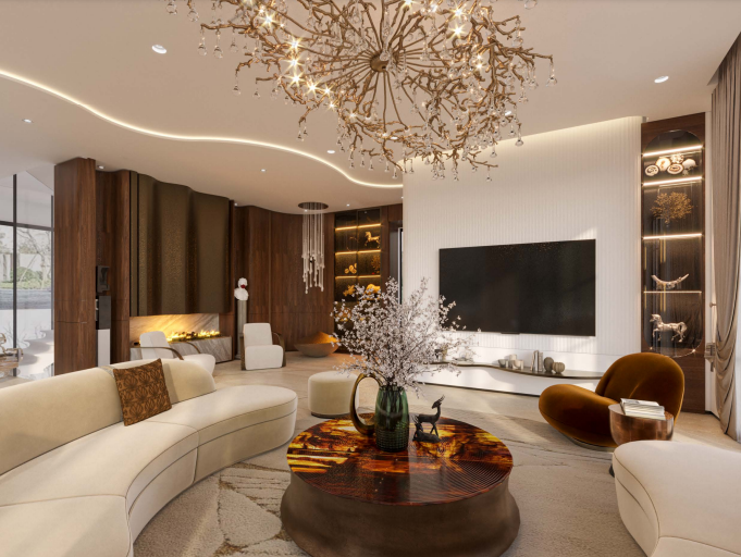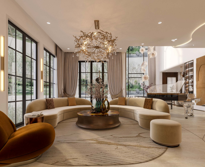 Điểm nhấn đặc biệt trong thiết kế căn biệt thự là một phần không gian phòng khách thông tầng. Khoảng trần cao được gia chủ kết hợp lắp đặt vách nhôm kính uốn vòm khổ lớn ở mặt ngoài, kích thước 2.690mm*6.488mm, sử dụng kính hộp hai lớp cường lực, mang đến không gian thoáng đãng, nhưng vẫn đảm bảo an toàn, mát mẻ vào những ngày hè và đủ kín, ấm áp trong mùa đông.