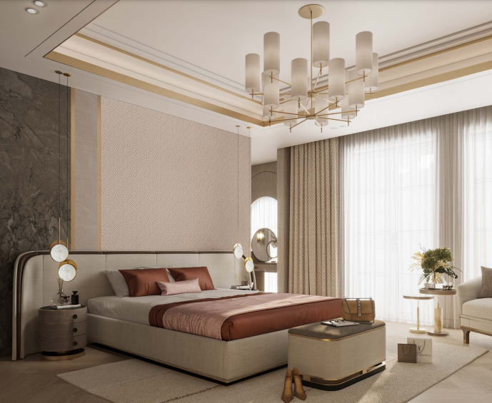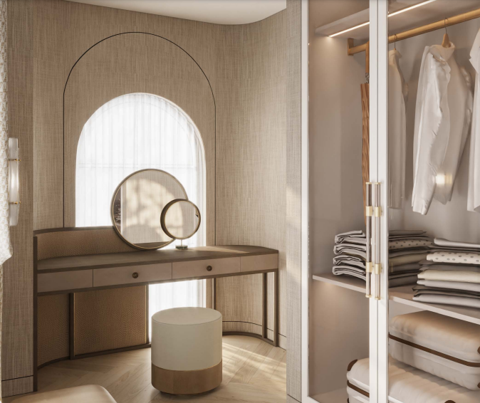 Khu vực thay đồ phòng ngủ master tầng 3 ngôi nhà bớt đơn điệu và chấm phá nét duyên dáng, mềm mại khi có thêm sự xuất hiện của cửa nhôm uốn vòm, nội thất điểm nhấn với hình trụ, tròn.