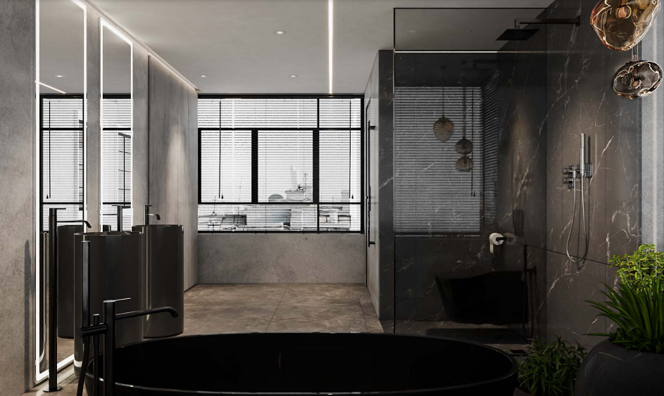 Thiết kế cửa sổ và vách kính cho khu vực phòng tắm biệt thự.