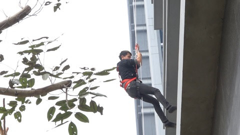 - Bước 4: Dùng tay điều chỉnh dây và người từ từ đi xuống. Khi chạm đất, lập tức nới lỏng và tháo đai an toàn, tránh xa nơi nguy hiểm.