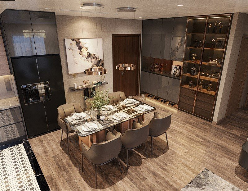 Tại dự án Hoàng Thành Pearl, bên cạnh những ô cửa, vách kính lớn giúp mở rộng tầm nhìn ra bên ngoài, cửa gỗ thông phòng được thi công nhằm đồng bộ “tone sure tone” với đồ nội thất.