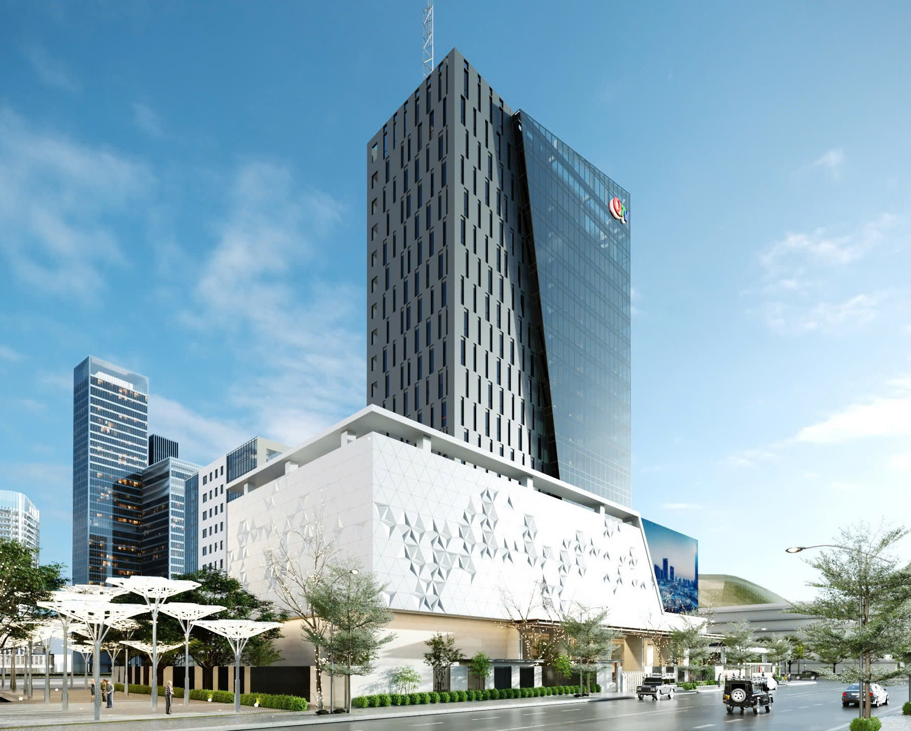 Công trình thiết kế chiều cao 20 tầng với diện tích sàn gần 22.000 m2. Trong đó, khối đế cao 5 tầng, khối tháp cao 14 tầng là khu làm việc chuyên dùng, khu phim trường, khu vực kỹ thuật, khu phục vụ ăn + bếp, khu sử dụng chung; 1 tầng hầm được bố trí khu vực đỗ xe, các khu vực kỹ thuật tòa nhà… Tòa nhà có thiết kế kiến trúc đặc biệt, lấy cảm hứng từ cảnh quan hòn Trống – Mái, hòn Cánh buồm, trên cơ sở hoà quyện về hình khối gợi liên tưởng tới hình ảnh những ngọn núi đá với tạo hình kỳ thú, giao hoà núi non - mây trời - biển đảo với 3 gam màu chủ đạo (xám, trắng, xanh).