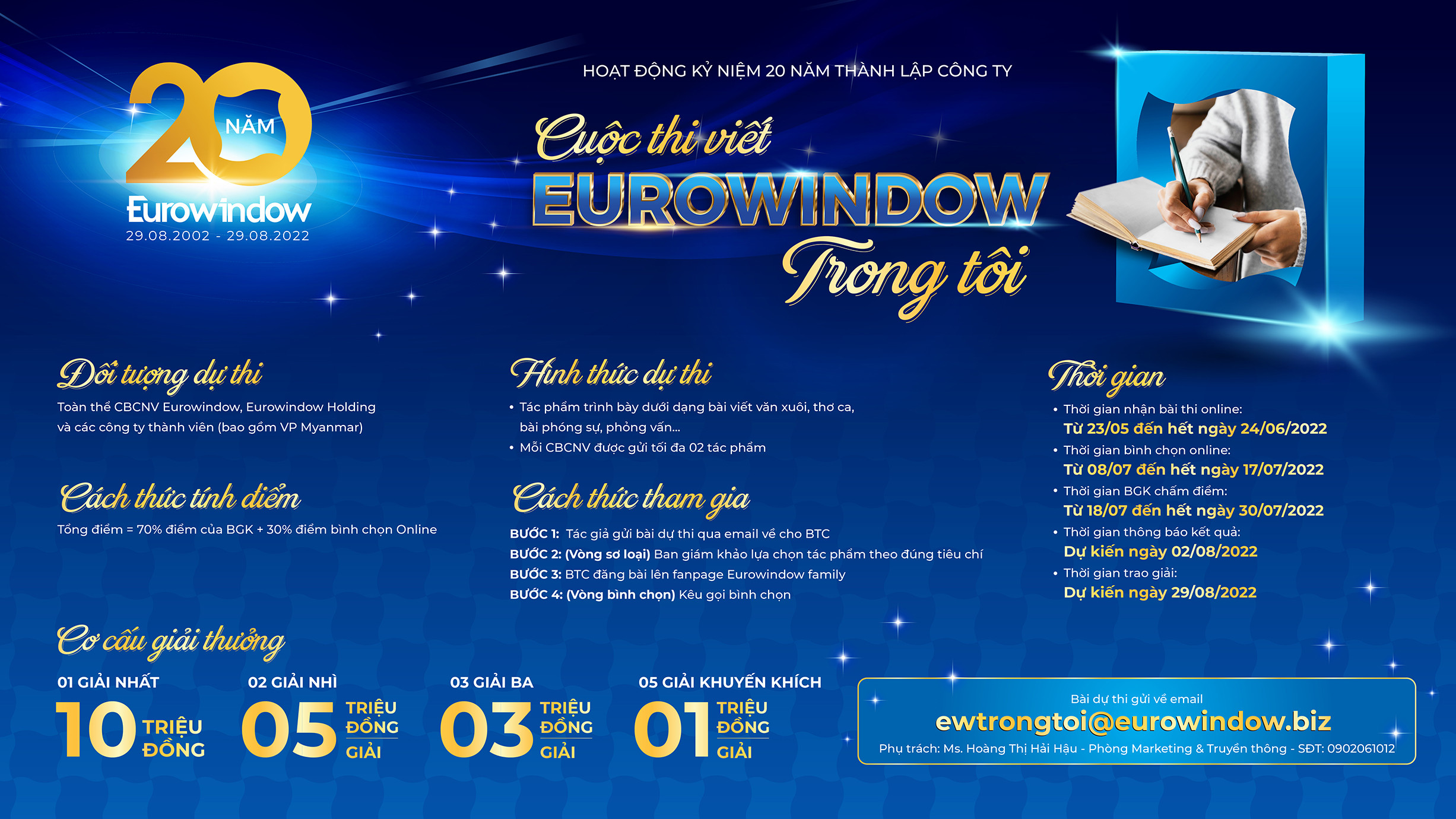 Nhằm lan tỏa những hình ảnh, tư duy tích cực gắn liền với uy tín thương hiệu, văn hóa doanh nghiệp, nét đẹp lao động trong tập thể... cuộc thi viết “Eurowindow trong tôi” mở ra là sân chơi thú vị dành cho tất cả CBCNV Eurowindow, Eurowindow Holding và các công ty thành viên nhân kỷ niệm 20 năm thành lập Eurowindow (29/08/2002 – 29/08/2022).