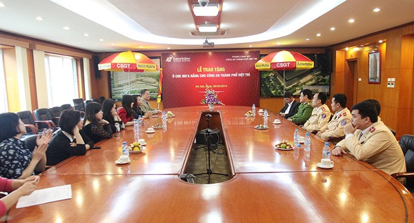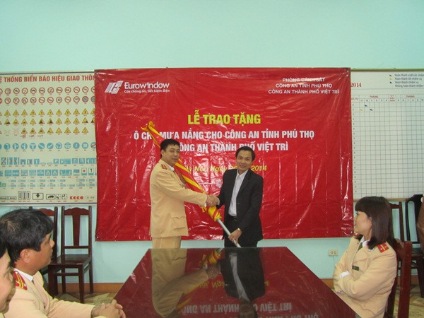 Cũng trong ngày, lễ trao tặng ô cho lực lượng CSGT Công an tỉnh Phú Thọ đồng thời được tổ chức tại Phòng cảnh sát công an tỉnh Phú Thọ trong không khí ấm áp, thân tình. Đại diện Công an tỉnh Phú Thọ, Đại úy Hoàng Xuân Phương, phó phòng Cảnh sát giao thông Công an tỉnh đã gửi lời cảm ơn tới lãnh đạo và toàn thể nhân viên công ty Eurowindow đã quan tâm và chia sẻ cùng lực lượng CSGT Công an Phú Thọ những khó khăn, vất vả trong công tác.