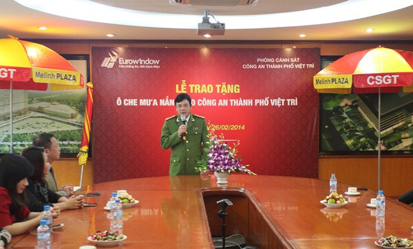 Tại buổi lễ này, Đại tá Lưu Đức Tỉnh – Giám đốc công an thành phố Việt Trì đã chia sẻ: “Lực lượng cảnh sát giao thông luôn là lực lượng phải làm việc vất vả, phải ở ngoài đường bất kể mưa nắng cũng không được di chuyển. Do vậy, chúng tôi thực sự cảm ơn tấm lòng của công ty Eurowindow. Các đồng chí đã nghĩ ra được việc tặng ô che mưa nắng cho lực lượng công an và cảnh sát giao thông chúng tôi. Tuy giá trị vật chất không lớn, nhưng ý nghĩa tình cảm là vô cùng sâu sắc. Tôi là người không trực tiếp ra đường, nhưng cán bộ chiến sĩ của tôi đứng ngoài đường làm nhiệm vụ và tôi thấu hiểu những vất vả của công việc này. Vì thế tôi cho rằng việc trao tặng những chiếc ô che mưa, che nắng của công ty là một cử chỉ cao đẹp”.
