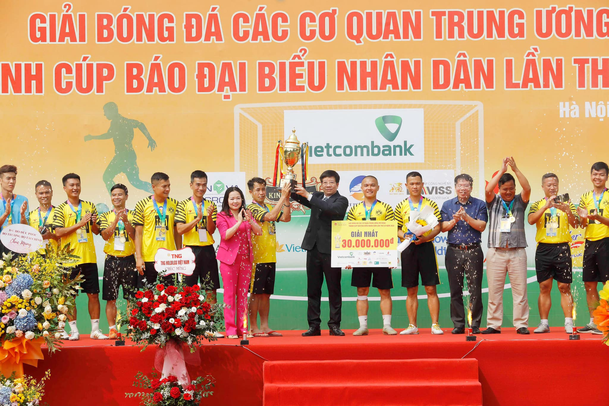 Ông Phạm Đình Toản - Phó Chủ nhiệm Văn phòng Quốc hội và đại diện Bant tổ chức trao giải Nhất cho Đội bóng vô địch mùa giải 2022.