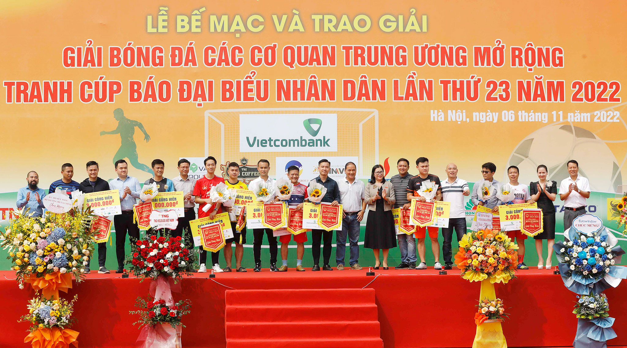 Bà Lại Ngọc Dung – Giám đốc truyền thông Eurowindow cùng một số nhà tài trợ, khách mời lên trao giải Cống hiến cho 12 đội bóng tranh Cúp Báo Đại biểu Nhân dân năm 2022.