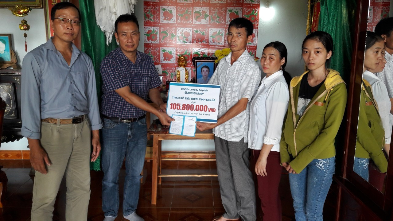 Ngày 21/05 vừa qua, đại diện phòng HCNS và BQLCDA Eurowindow đã đến thăm hỏi, động viên và trao tặng sổ tiết kiệm trị giá hơn 100 triệu đồng do CBCNV công ty quyên góp, ủng hộ gia đình anh Trần Đức Khánh (xóm 11, Quỳnh Vinh, Hoàng Mai, Nghệ An).
