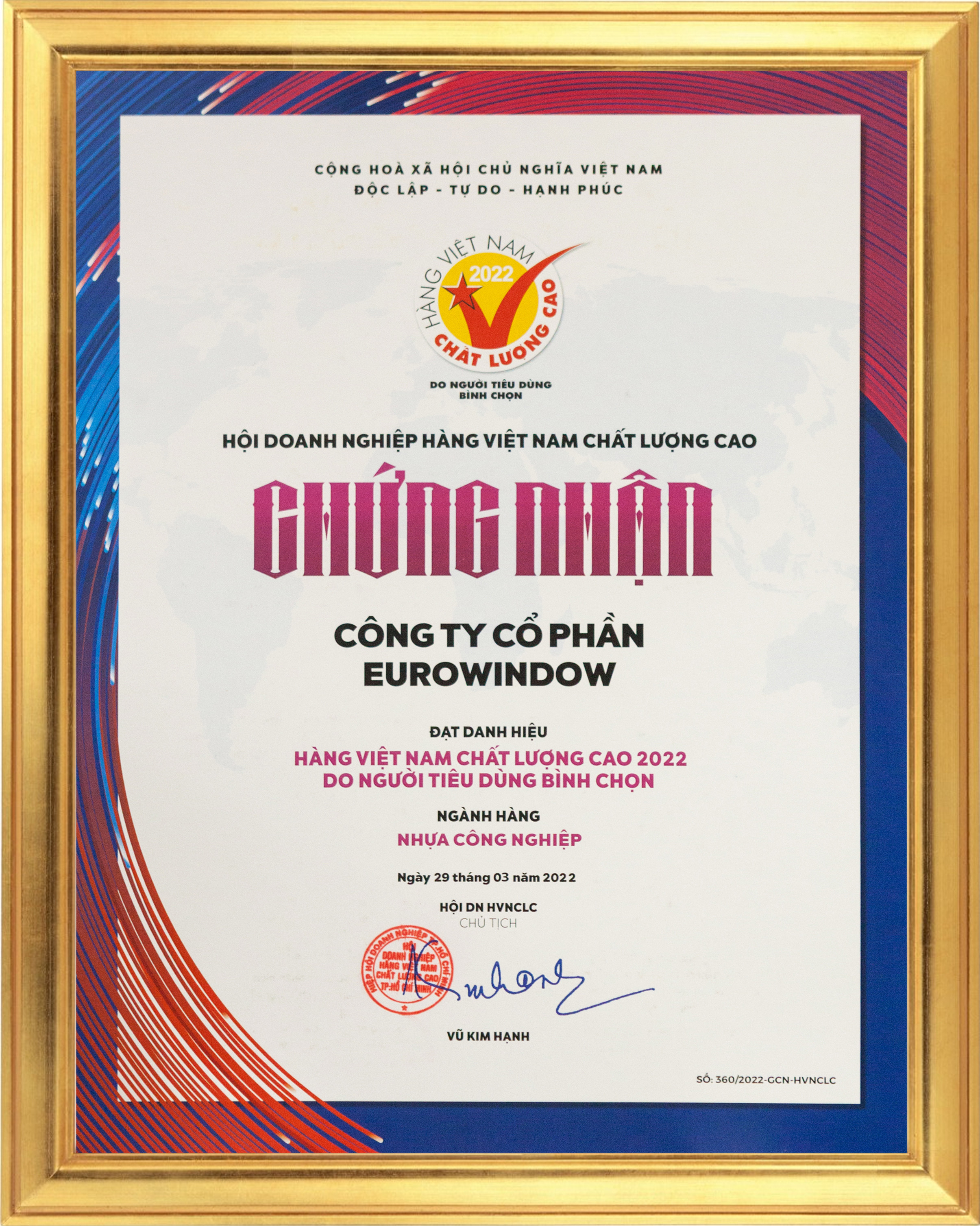 Ghi tên trong danh sách các doanh nghiệp tiêu biểu được bình chọn Hàng Việt Nam chất lượng cao 2022, Eurowindow đã có 13 năm liên tiếp đạt chứng nhận uy tín này.
