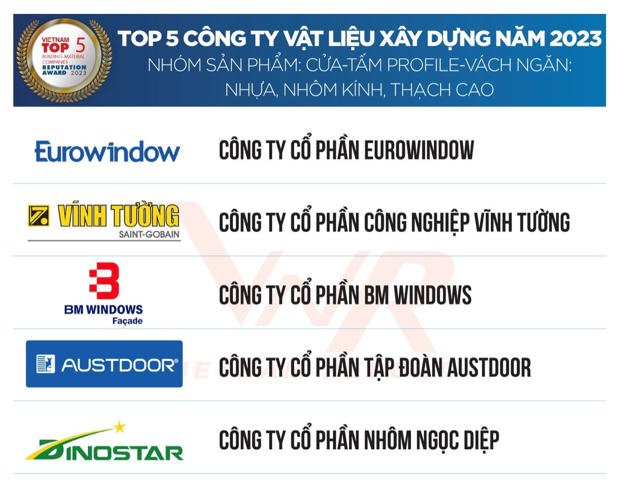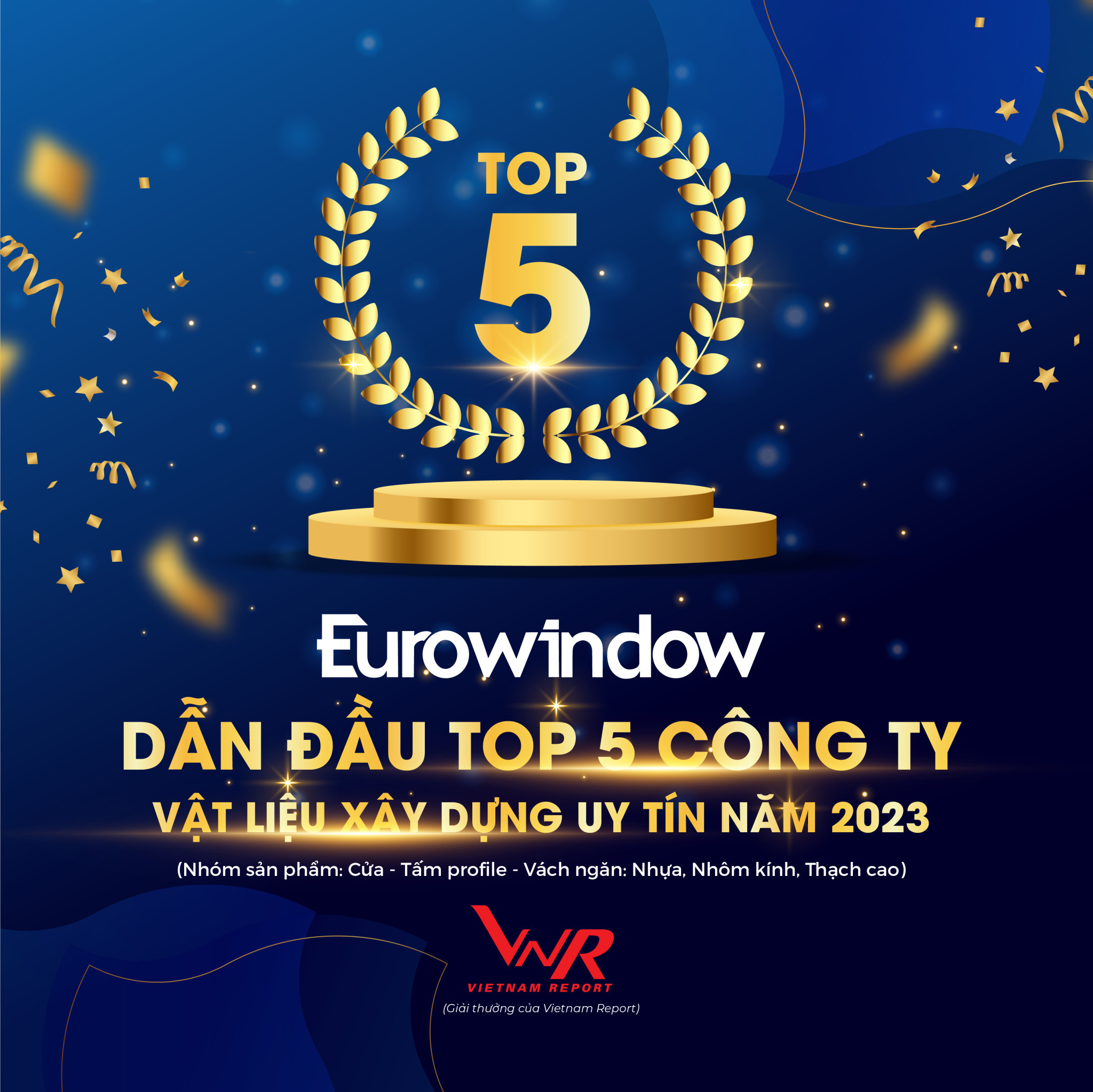 Bằng sự nỗ lực bền bỉ và những chiến lược thích ứng hiệu quả sau đại dịch Covid-19, Eurowindow đã vượt qua hàng nghìn doanh nghiệp để giữ vững thành tích dẫn đầu trong Top 5 Công ty Vật liệu xây dựng uy tín 2023 (Nhóm sản phẩm Cửa - tấm profile - vách ngăn: nhựa, nhôm kính, thạch cao). Nhiều năm liên tiếp được vinh danh trong Top công ty vật liệu xây dựng uy tín là minh chứng cho thấy sự tin tưởng của hàng triệu khách hàng, đối tác cũng như sự ghi nhận của các tổ chức uy tín và cộng đồng đối với những nỗ lực của Eurowindow.