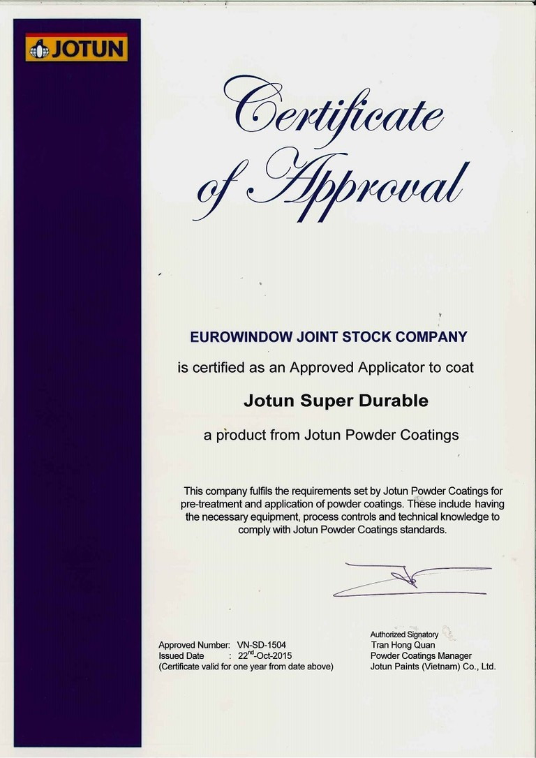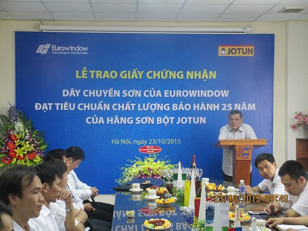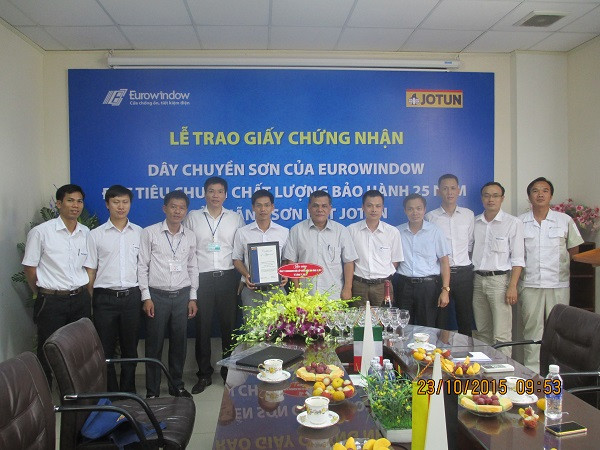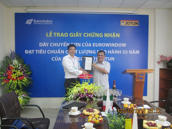 Ngày 23/10/2015, Công ty CP Eurowindow đã chính thức nhận giấy chứng nhận cho sản phẩm sơn đạt tiêu chuẩn bảo hành 25 năm của hãng sơn bột Jotun (Na Uy) sau khi đã trải qua giai đoạn kiểm nghiệm, đánh giá khắt khe của hãng này.