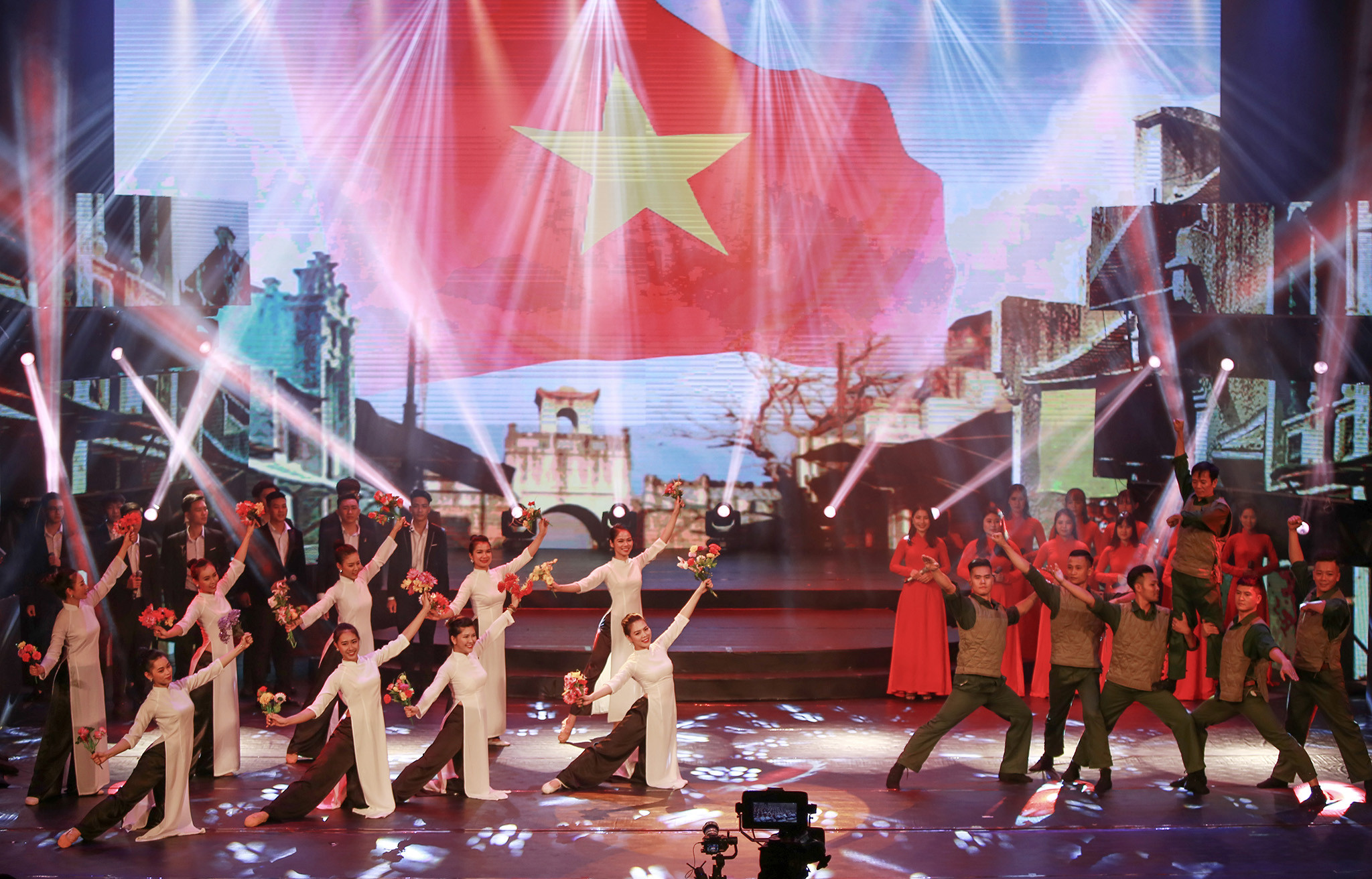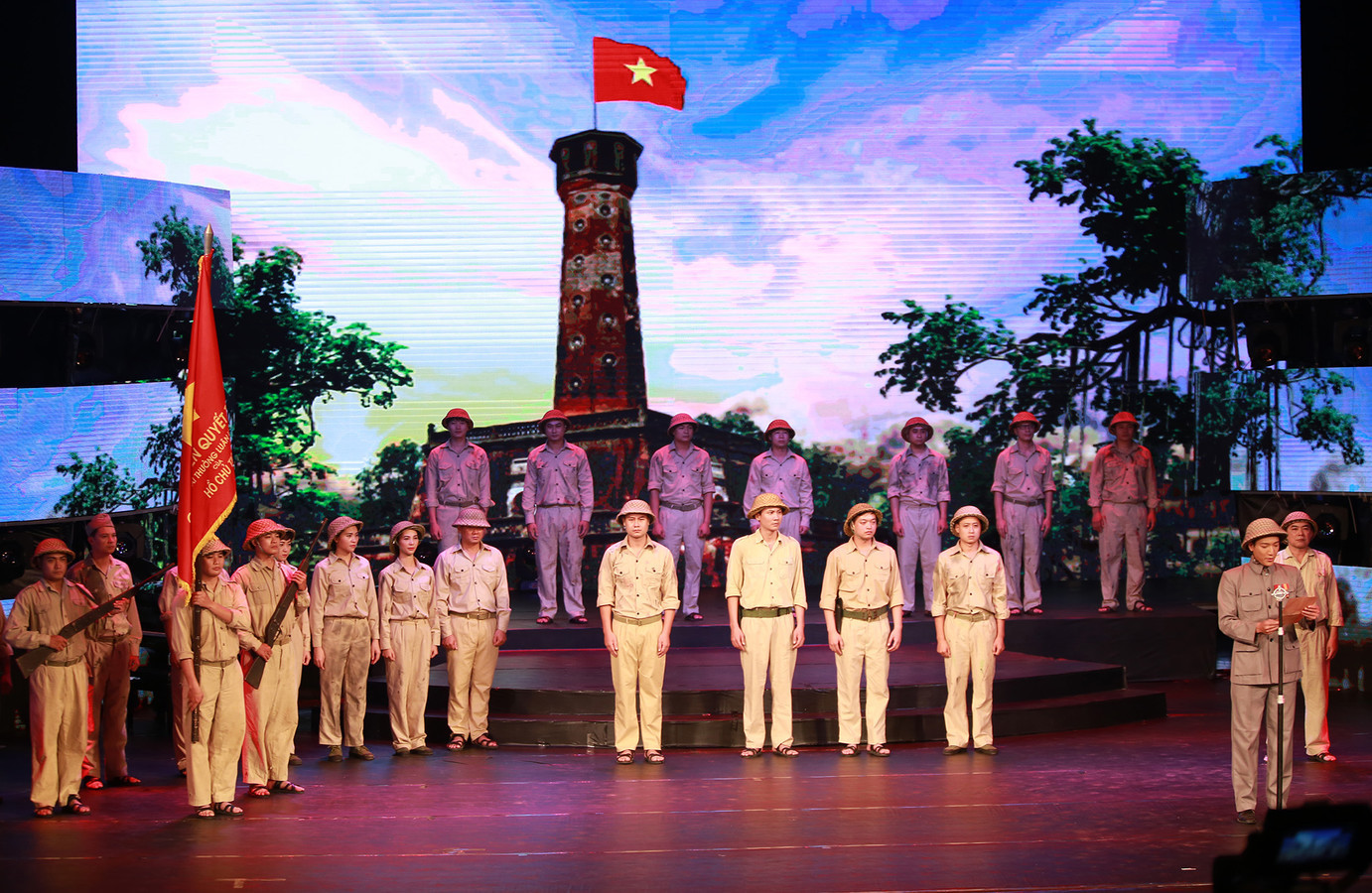 Điểm nhấn của chương trình là tiểu phẩm tái hiện lễ chào cờ lịch sử đầu tiên trong Ngày Giải phóng Thủ đô tại sân Cột Cờ