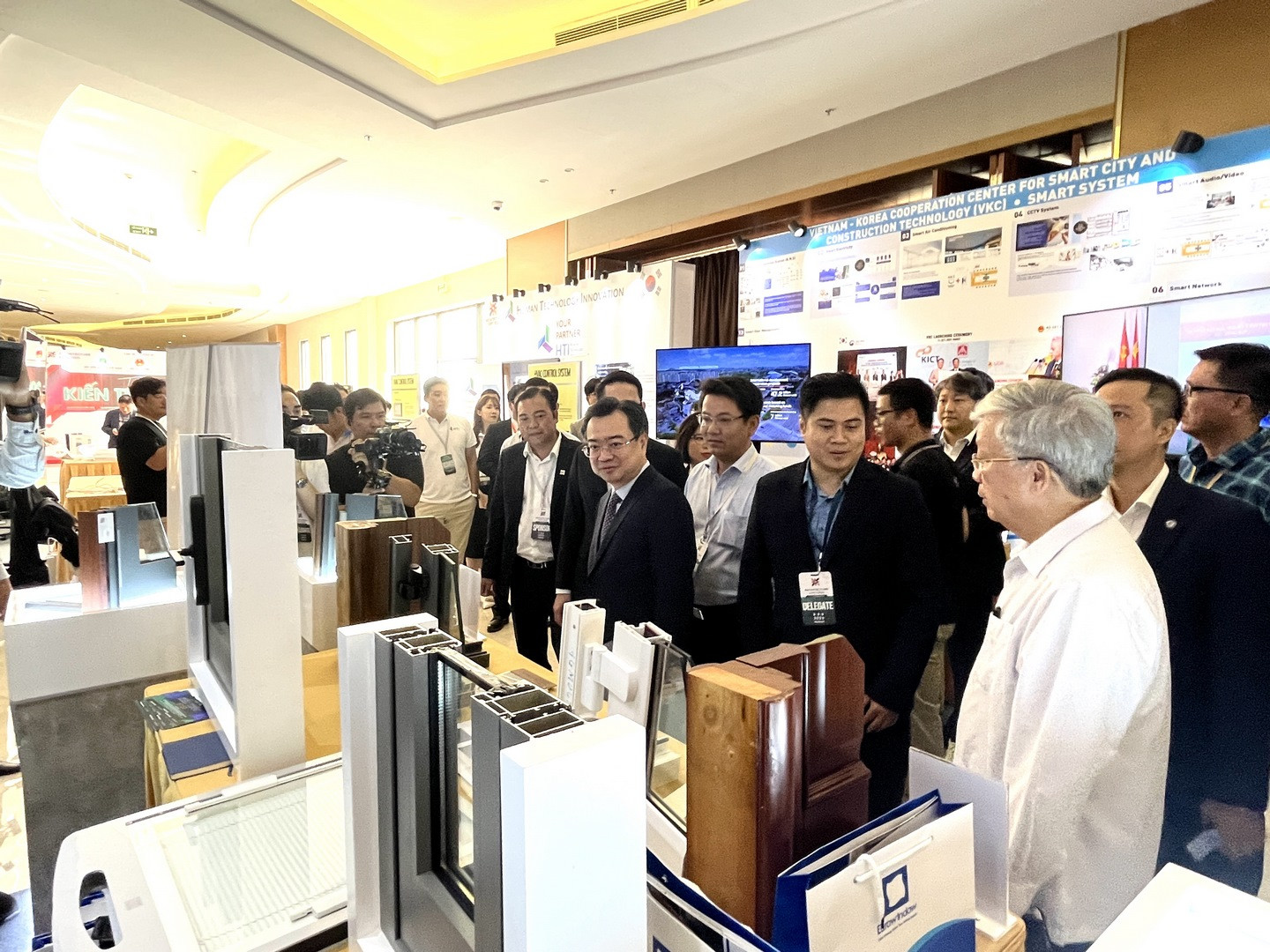 Bộ trưởng Bộ Xây dựng Nguyễn Thanh Nghị và đoàn đại biểu tham quan khu trưng bày sản phẩm Eurowindow bên lề triển lãm.
