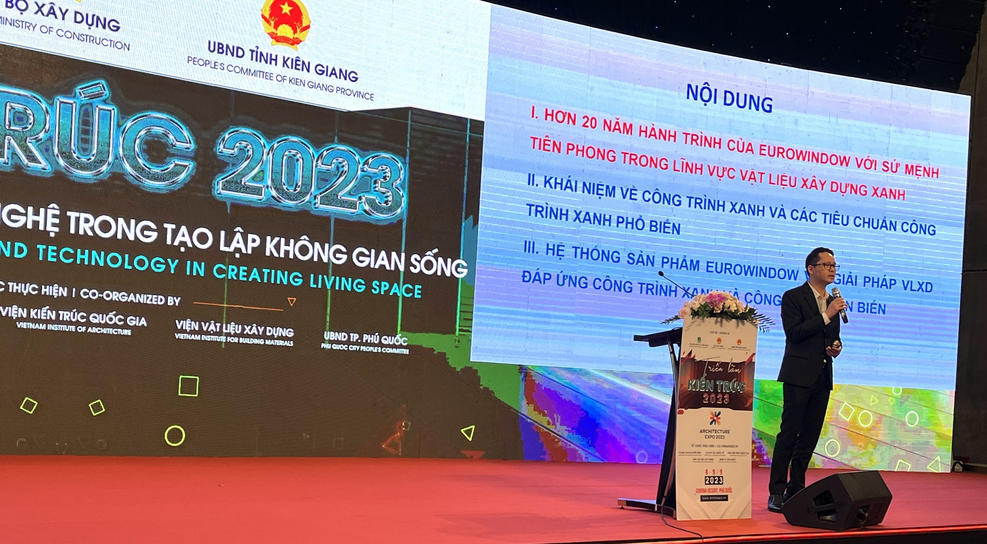 Tham luận tại sự kiện, ông Trần Quang Hưng – Giám đốc Kỹ thuật đã có bài thuyết trình, giới thiệu hệ thống các giải pháp cửa và vách nhôm kính Eurowindow cung cấp trên thị trường. Các giải pháp sở hữu tính năng ưu việt về độ kín khít, độ chịu tải trọng gió lớn, khả năng cách nhiệt tốt, lớp sơn và lớp mạ có khả năng kháng hơi muối biển… đáp ứng tiêu chí chứng nhận công trình xanh, tiết kiệm năng lượng, đặc biệt hiệu quả đối với công trình ven biển.