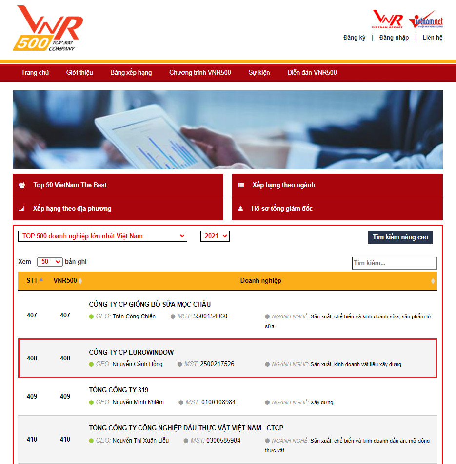 Mới đây, Công ty Cổ phần Báo cáo Đánh giá Việt Nam (Vietnam Report) vừa phối hợp cùng Báo VietnamNet công bố Bảng xếp hạng VNR500 - Top 500 Doanh nghiệp lớn nhất Việt Nam năm 2021. Đây là năm thứ 11 liên tiếp Eurowindow được tôn vinh trong bảng danh sách này.