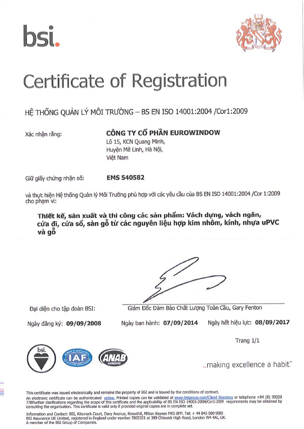 Ngày 7/9/2014, Viện Tiêu Chuẩn Anh Quốc (BSI) tiếp tục cấp giấy chứng nhận số EMS 540582 hệ thống quản lý môi trường của Eurowindow phù hợp với các yêu cầu của tiêu chuẩn ISO 14001: 2004 cho phạm vi: Thiết kế sản xuất và thi công các sản phẩm: Vách dựng, vách ngăn, cửa đi, cửa sổ, sàn gỗ từ các nguyên liệu hợp kim Nhôm, Kính, Nhựa uPVC và Gỗ.