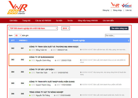 Xếp hạng của Eurowindow trong Top 500 Doanh nghiệp lớn nhất Việt Nam năm 2018