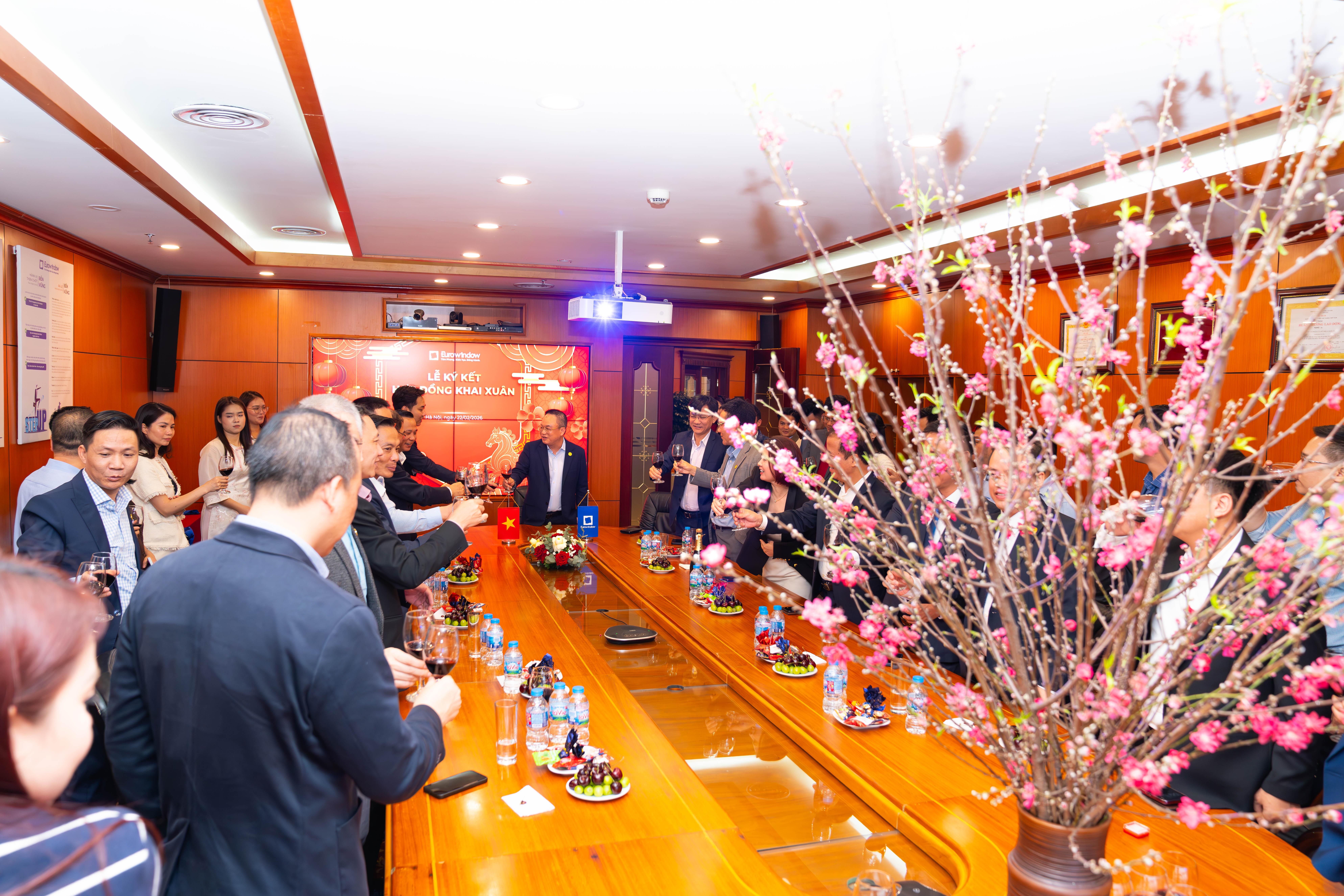 Nghi thức nâng ly chúc mừng năm mới diễn ra trong không khí rộn ràng, ấm áp, cùng buổi trò chuyện thân tình đầu xuân đã khép lại lễ ký kết. Những lời chúc sức khỏe, thành công và hanh thông được gửi tới toàn thể cán bộ, nhân viên, thể hiện kỳ vọng về một năm 2026 nhiều cơ hội và bứt phá.