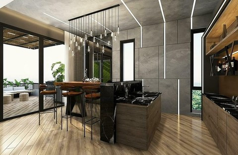 Một góc không gian phòng khách kết nối phòng bếp tại nhà mẫu The Grand Villa