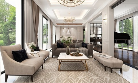 Trong khi đó, căn biệt thự mẫu theo phong cách bán cổ điển mang hình khối mạnh mẽ nhưng không quá cầu kỳ, toát lên vẻ sang trọng và đẳng cấp. Không gian tầng trệt thiết kế theo một trục đối xứng từ sảnh đón, phòng khách bàn ăn vào tới bếp kết hợp với hệ khung cửa kính cao bắt trọn view hồ bơi bên ngoài.