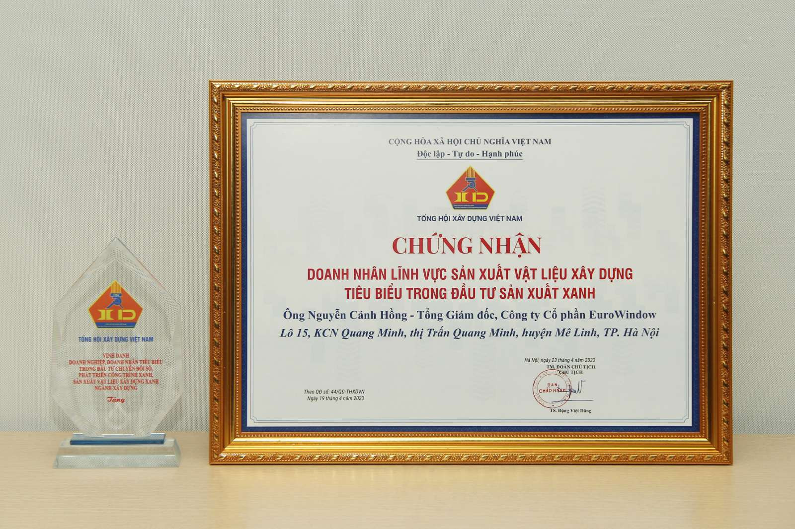 Ngày 23/4 vừa qua, Eurowindow và CEO Nguyễn Cảnh Hồng đã vinh dự được Tổng hội Xây dựng Việt Nam trao chứng nhân vinh danh Doanh nghiệp Tiêu biểu, Doanh nhân Tiêu biểu trong đầu tư sản xuất xanh. Đây là sự ghi nhận cho nỗ lực của Eurowindow khi không ngừng ứng dụng công nghệ tiên tiến vào sản xuất vật liệu xây dựng xanh, thúc đẩy phát triển công trình xanh có kiến trúc bền vững tại Việt Nam.