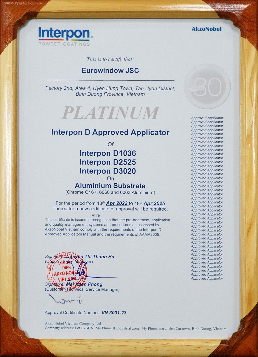 Vượt qua nhiều tiêu chí khắt khe, tuân thủ quy trình đánh giá và thử nghiệm nghiêm ngặt, kéo dài đến 4000 giờ (tương đương gần 6 tháng), Eurowindow là một trong số ít doanh nghiệp tại Việt Nam được trao chứng nhận dây chuyền sơn đạt tiêu chuẩn bảo hành 30 năm của hãng AkzoNobel (Hà Lan).