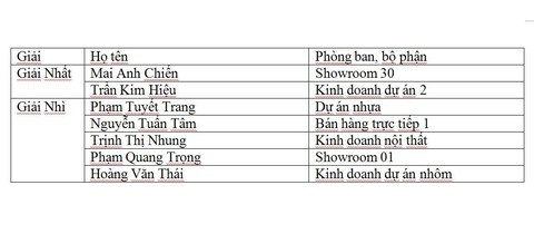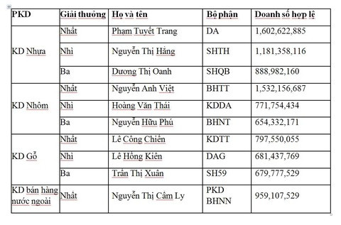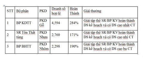 Đồng thời, dựa trên thể lệ, hình thức thi đua, đáp ứng tiêu chí hoàn thành doanh số đề ra ban đầu, ban tổ chức cũng đã rà soát và công bố danh sách các cá nhân, tập thể xuất sắc nhất, trao giải chung cuộc cho NVKD có doanh số cao Nhất/Nhì/Ba; giải chung cuộc cho tập thể showroom/bộ phận/khu vực có doanh số cao Nhất/Nhì/Ba.