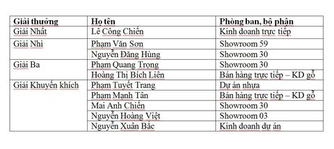 Đạt giải đặc biệt khi có doanh số cao nhất chương trình (hơn 2,537 tỷ đồng), NVKD Hoàng Thị Bích Liên – Bộ phận kinh doanh trực tiếp, phòng KD gỗ chia sẻ: “Ngoài sự nỗ lực của bản thân cộng với may mắn thì em nghĩ NVKD có thể tận dụng lợi thế bán hàng qua kênh tư vấn. Khi mình làm tốt, mọi người sẽ giới thiệu thêm khách hàng. Không biết nói gì hơn, em rất cảm ơn Ban lãnh đạo đã tạo điều kiện và hỗ trợ cho các NVKD để hoàn thành và vượt mục tiêu doanh số đề ra”.
