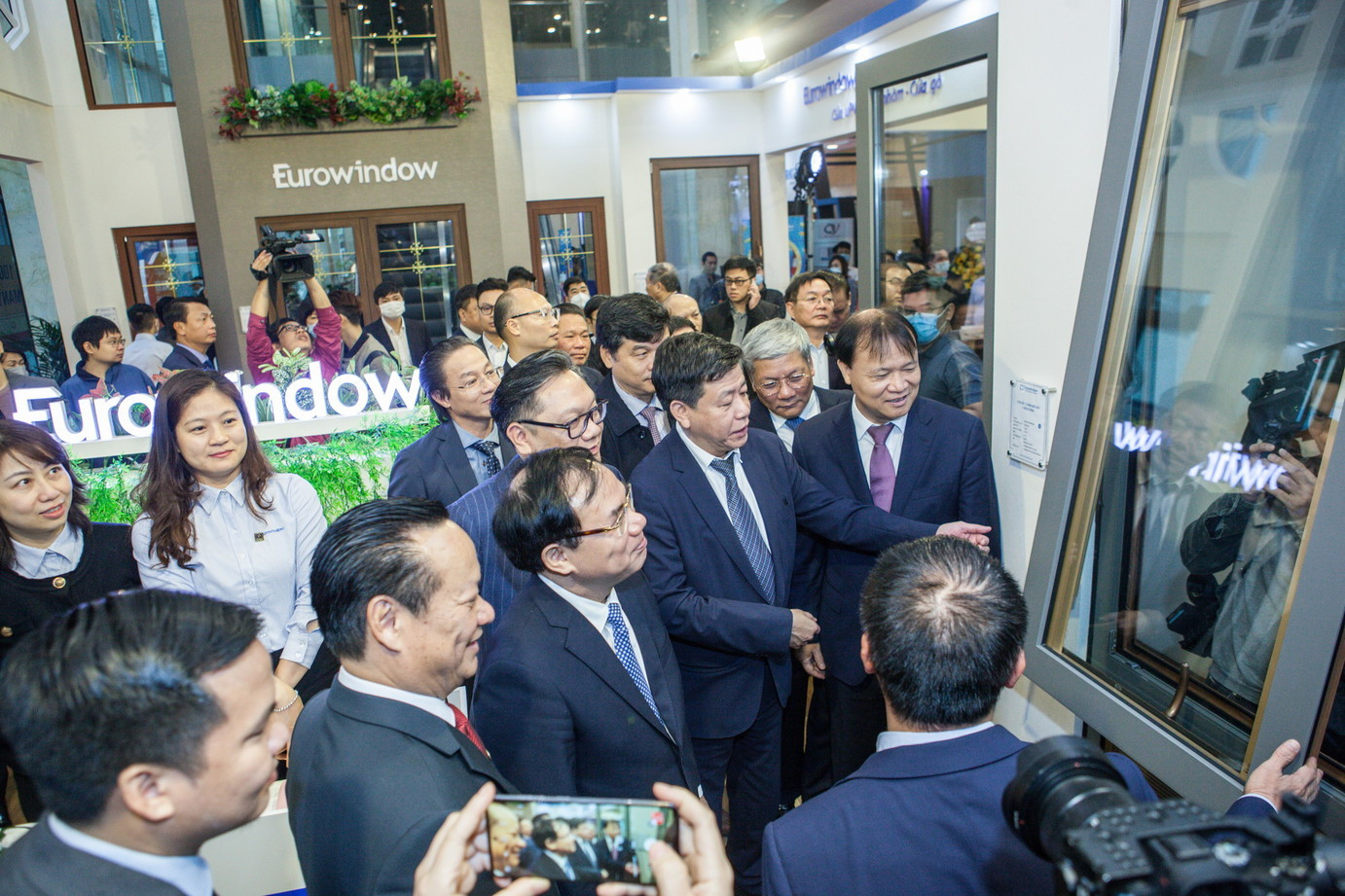 Ngay sau lễ khai mạc, Thứ trưởng Bộ Xây dựng Nguyễn Văn Sinh cùng các lãnh đạo cấp cao tham quan khu trưng bày sản phẩm của Eurowindow