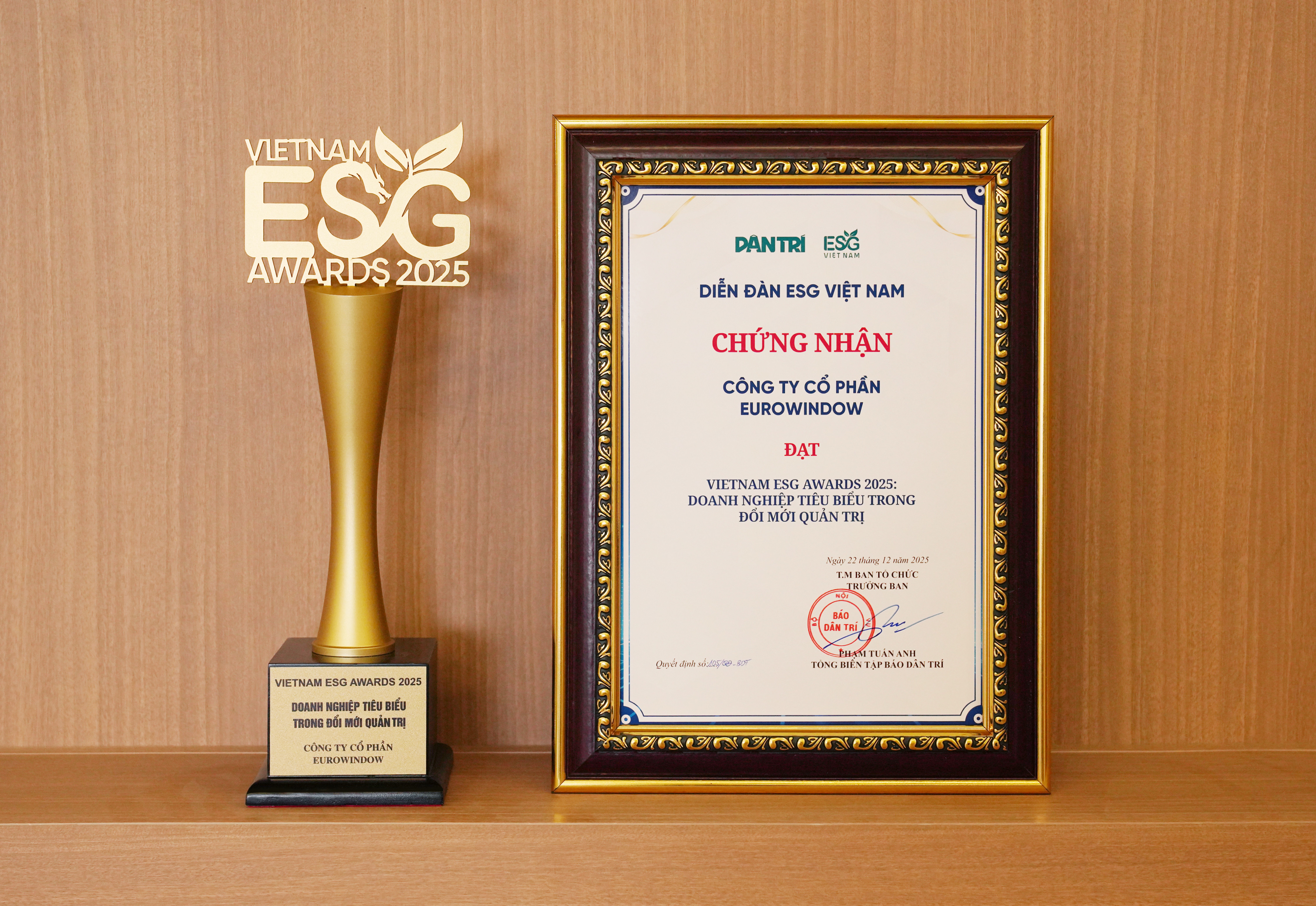 Eurowindow là doanh nghiệp tiên phong ngành vật liệu xây dựng, đơn vị duy nhất ngành cửa được vinh tại Vietnam ESG Awards 2025. Giải thưởng là sự ghi nhận cho định hướng phát triển nhất quán của Eurowindow trong việc ứng dụng khoa học công nghệ, chuyển đổi số tích hợp các tiêu chuẩn (Môi trường – Xã hội – Quản trị) ESG vào chiến lược sản xuất, kinh doanh và quản trị doanh nghiệp. Từ nghiên cứu sản phẩm, lựa chọn vật liệu, tiết kiệm năng lượng, kiến tạo không gian sống an toàn, tiện nghi, thân thiện môi trường cho cộng đồng, nâng cao năng lực quản trị, thúc đẩy phát triển kiến trúc bền vững, công trình xanh tại Việt Nam.
