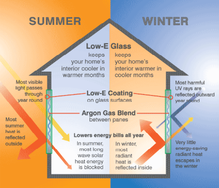 Kính Low-e là loại kính được phủ lên bề mặt một loại hợp chất đặc biệt là lớp metalic siêu mỏng. Theo nguyên lý, loại kính này có khả năng ngăn chặn bức xạ nhiệt từ mặt trời vào mùa hè và giảm khuếch tán nhiệt độ vào mùa đông nên giữ được nhiệt độ ổn định trong phòng đồng thời đảm bảo độ sáng cho công trình. Loại kính này đặc biệt phù hợp lắp đặt ở khu vực có khí hậu nhiệt đới gió mùa như tại Việt Nam.