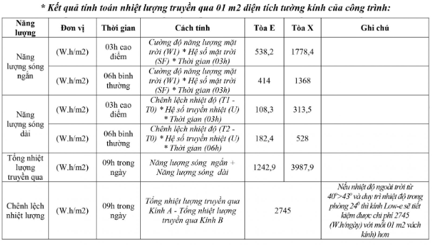 Lấy ví dụ thực tế, phân tích 2 công trình sử dụng 2 loại kính khác nhau, trong đó Tòa E dùng kính cách nhiệt Low-E, tòa X dùng kính cường lực thông thường, kết quả tính toán nhiệt lượng truyền qua như sau: