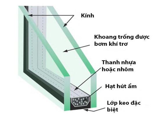 Minh họa chi tiết cấu tạo sản phẩm kính hộp ghép từ 2 lớp kính.
