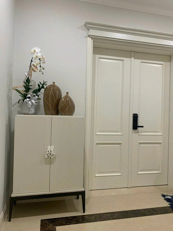 Mẫu cửa gỗ trắng 2 cánh pano đặc với đường chỉ nổi tinh tế trên bề mặt cánh không chỉ tạo điểm nhấn thẩm mỹ mà còn góp phần tôn lên vẻ sang trọng cho tổng thể không gian. Sắc trắng nhẹ nhàng kết hợp hài hòa cùng nội thất mang lại hiệu ứng ánh sáng tự nhiên, mang đến cảm giác mở rộng không gian sống, khiến căn phòng trở nên thoáng đãng hơn.