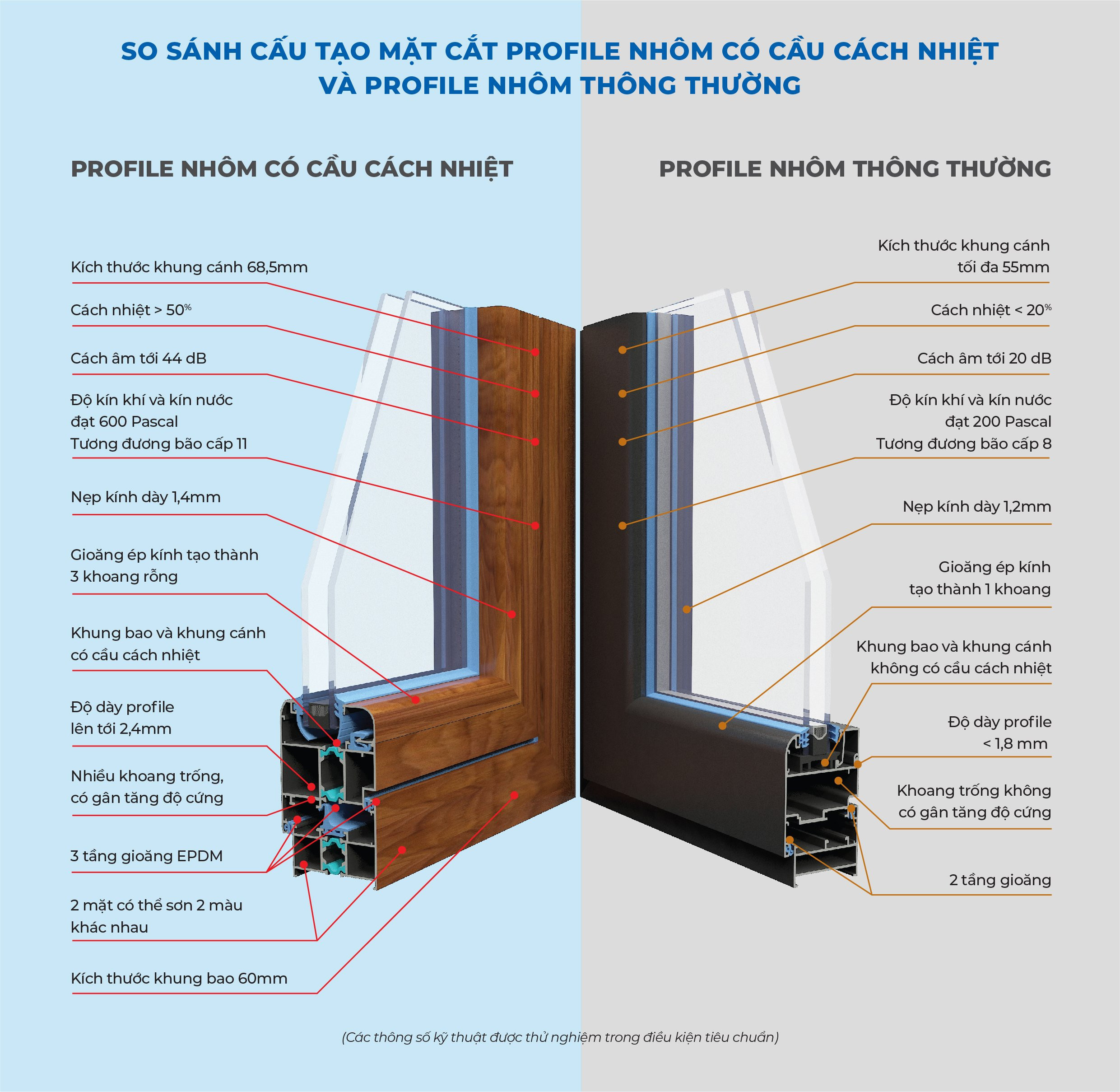 Cửa nhôm có cầu cách nhiệt: được cấu tạo từ hai lớp nhôm ngăn cách bằng dải polyamide, kết hợp kính hộp hoặc kính dán an toàn cách âm, giúp hạn chế truyền âm hiệu quả, phù hợp nhà phố mặt tiền lớn.