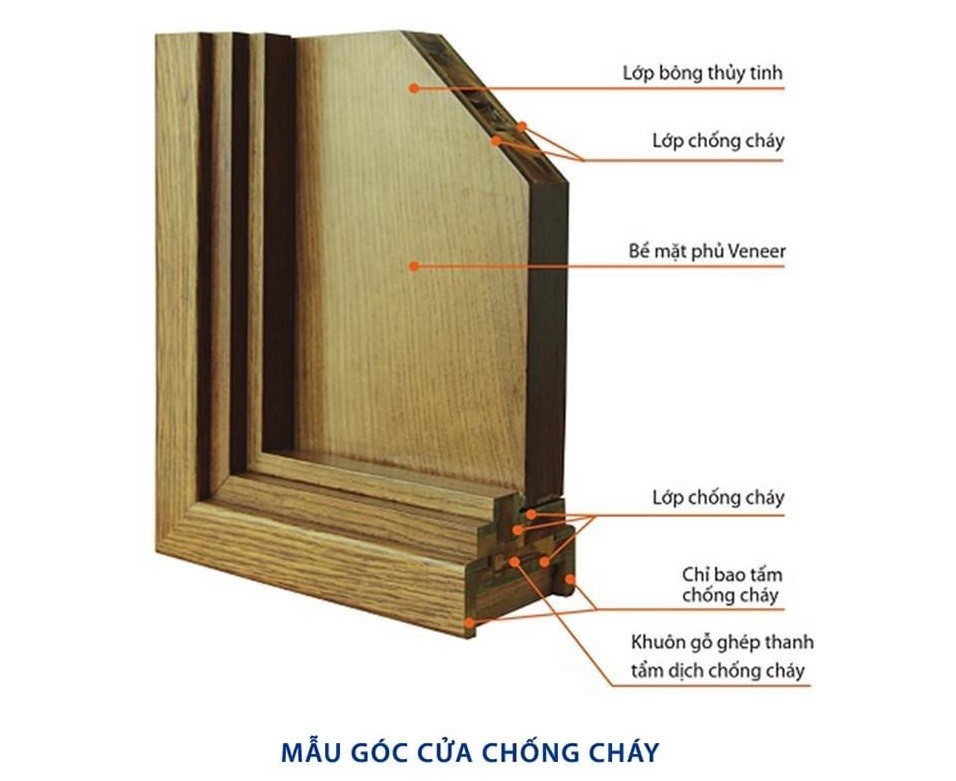 - Khuôn bao, thanh chặn làm từ gỗ ghép thanh phun tẩm dịch chống cháy. Bề mặt khuôn được phủ lớp MGO, MDF phủ veneer hoặc laminat, melamin hoàn thiện.