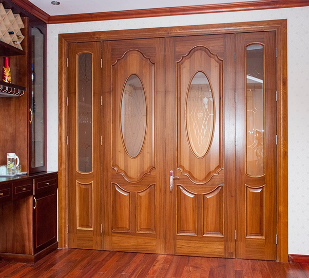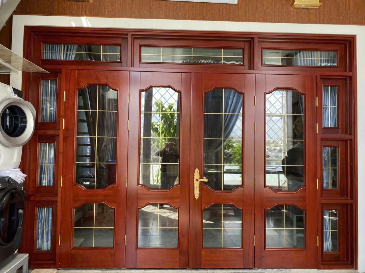 - Cửa gỗ pano kính hoa văn: Trang trí bằng các họa tiết nghệ thuật bằng nan hoa văn, giúp không gian thêm phần độc đáo và ấn tượng.