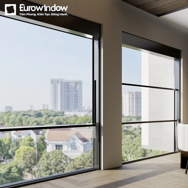 Bên cạnh đó, hệ vách kính trượt dọc tự động Eurowindow cũng là một lựa chọn lý tưởng cho phòng khách. Thiết kế cải tiến này giúp gia chủ dễ dàng chuyển đổi không gian từ mở thoáng sang kín đáo chỉ bằng một thao tác đơn giản, mang đến sự linh hoạt trong sử dụng. Nhờ hệ khung nhôm thanh mảnh và kính cường lực trong suốt, vách kính trượt dọc giúp tạo tầm nhìn rộng mở, tối ưu khả năng lấy sáng tự nhiên và đón gió mát. Sản phẩm còn được trang bị khóa đa điểm, hệ thống chống kẹt tay, đảm bảo an toàn khi vận hành.