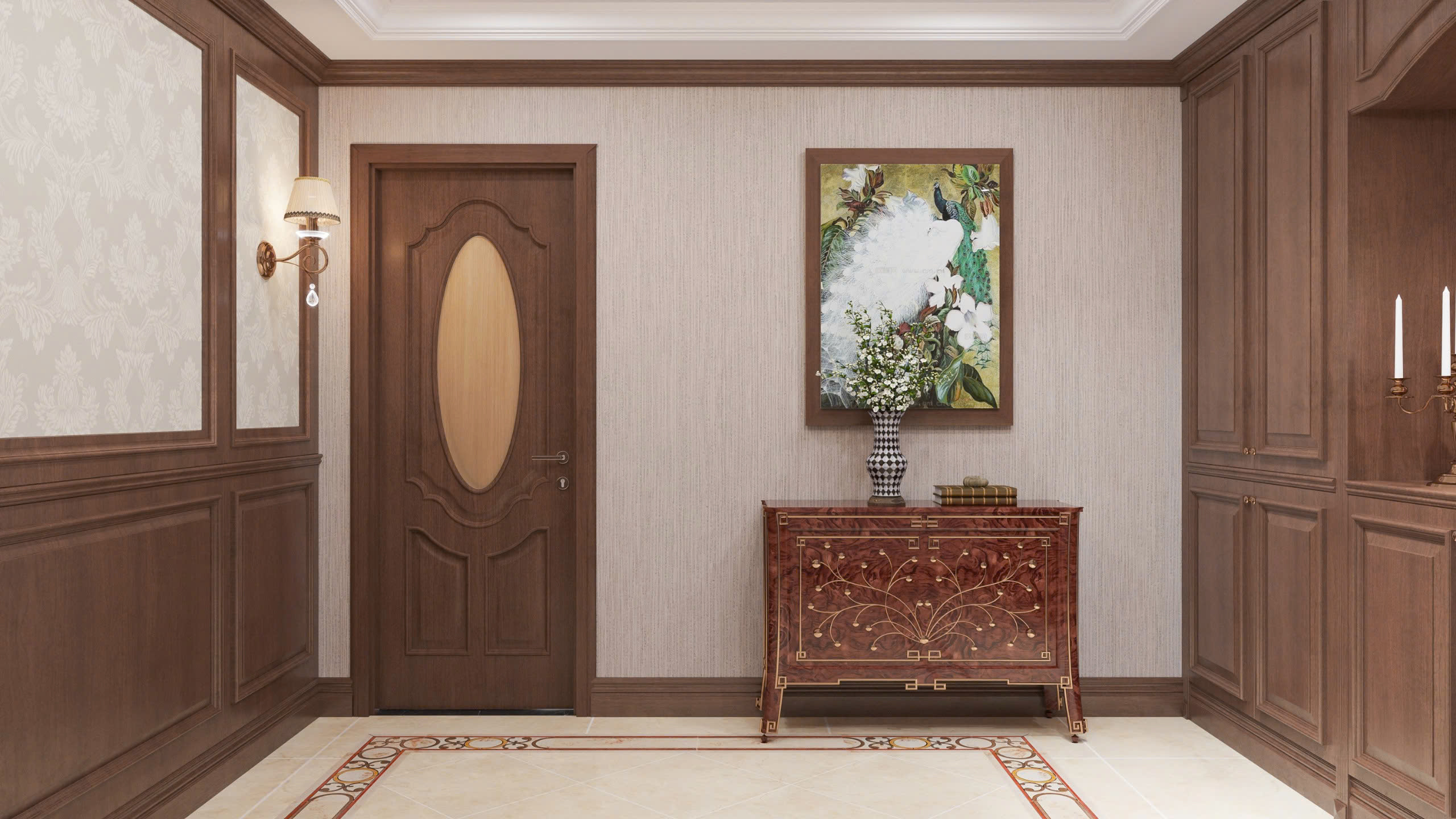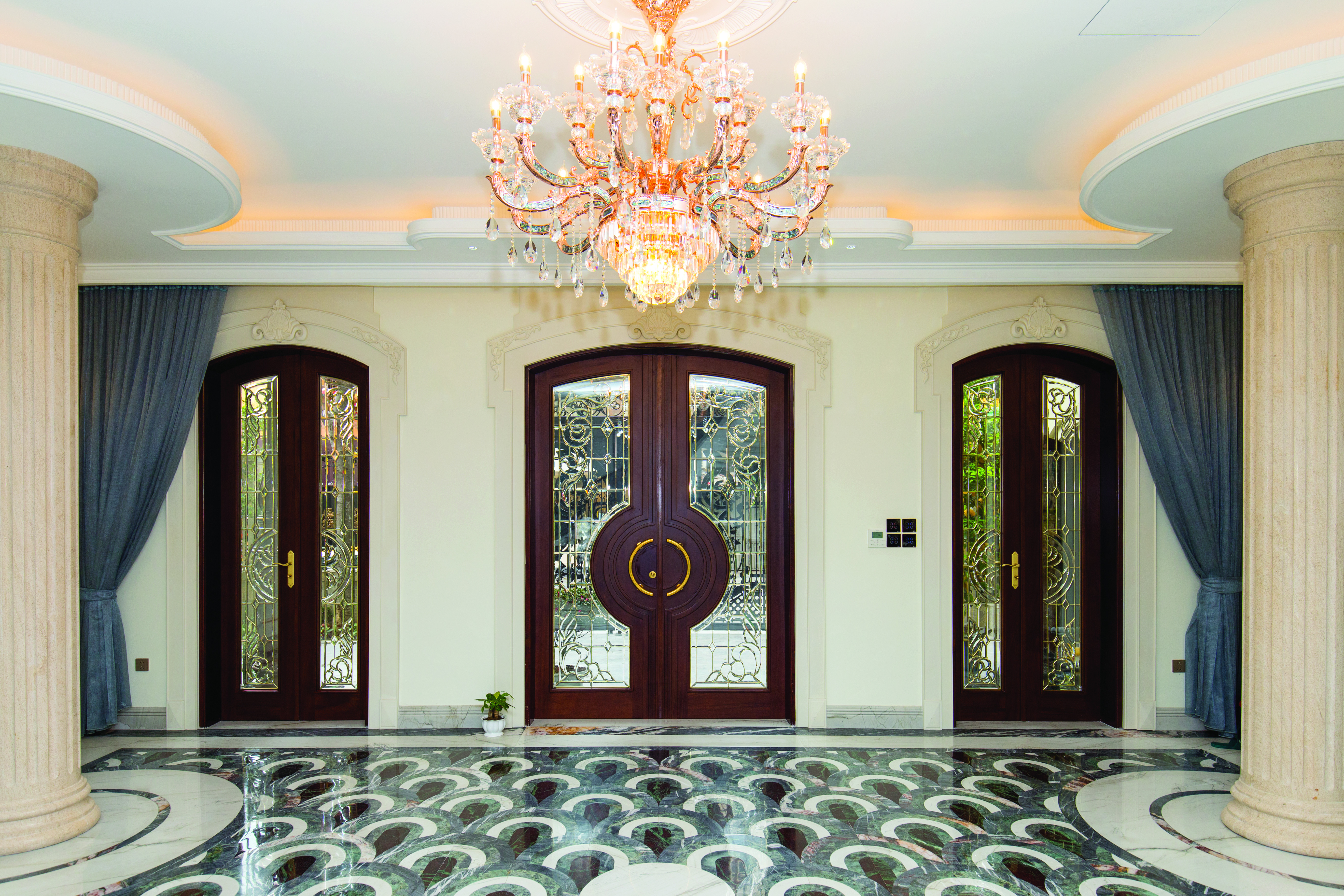 Mẫu cửa pano gỗ đặc với nhiều họa tiết trang trí lắp đặt làm cửa đi chính biệt thự kiến trúc tân cổ điển.