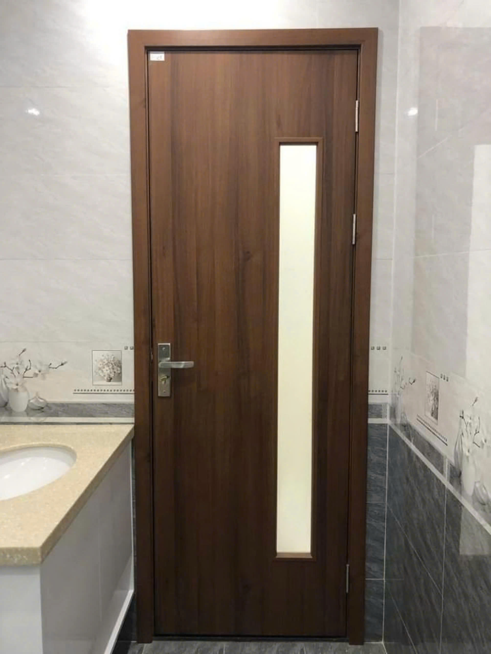 Mẫu cửa pano gỗ composite thông dụng lắp đặt ở phòng tắm.