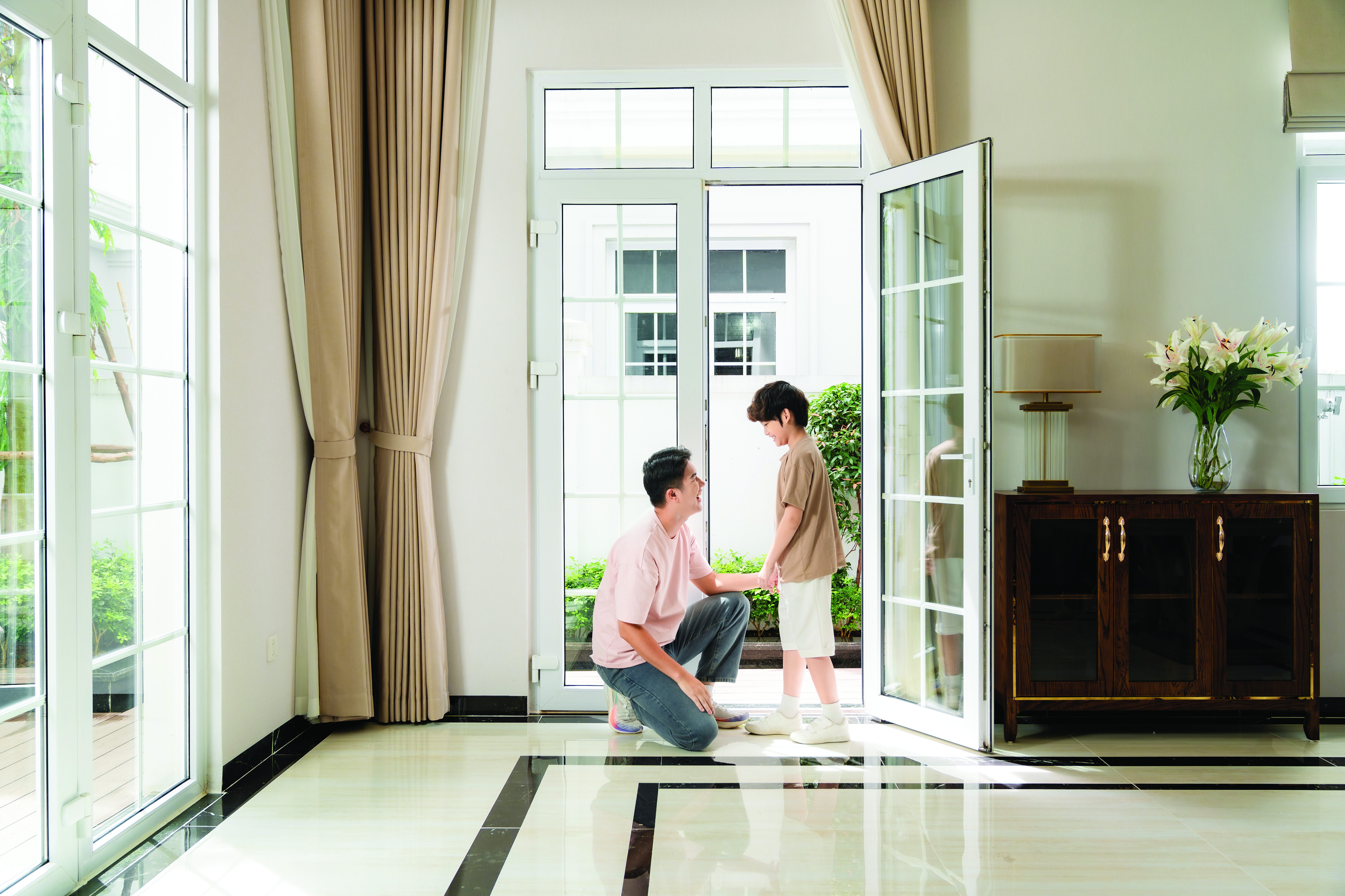 - Mặt tiền, cửa đi chính: Cửa uPVC lõi thép kết hợp kính hộp và gioăng kép sẽ ngăn thấm nước mưa tạt, giữ khô ráo và an toàn cho không gian bên trong.