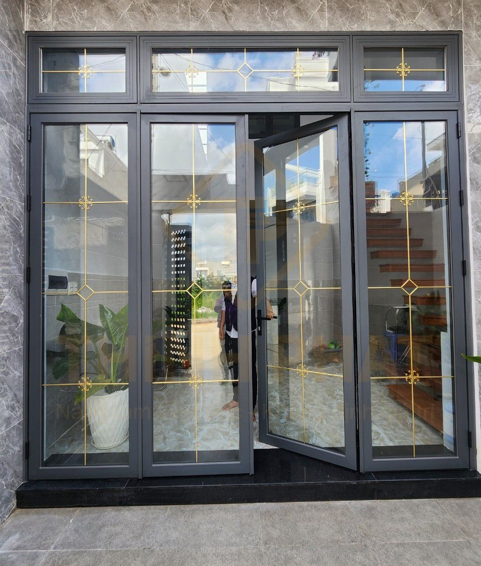Cửa nhôm kính hộp có nan trang trí lắp ở cửa đi chính ngôi nhà giúp không gian thông thoáng, mở rộng tầm nhìn và thẩm mỹ sang trọng