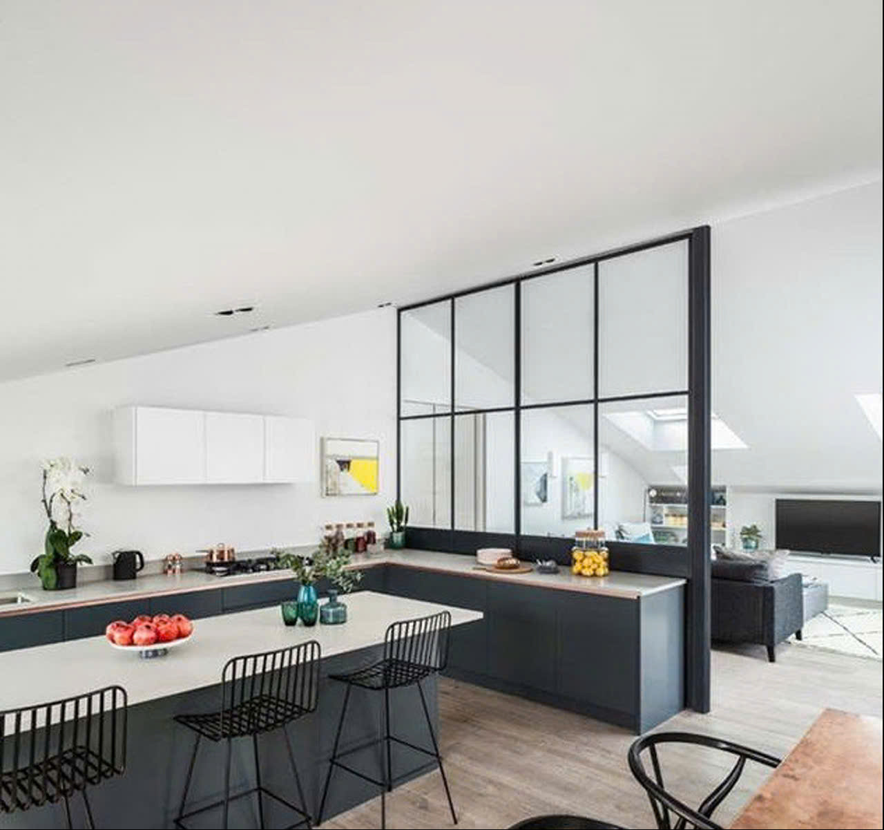 Trong những ngôi nhà phố có diện tích hạn chế, việc sử dụng vách kính để phân chia các khu vực chức năng như phòng khách – phòng ngủ, phòng bếp – phòng ăn… là giải pháp thông minh, vừa tiết kiệm diện tích vừa tối ưu hóa công năng sử dụng.