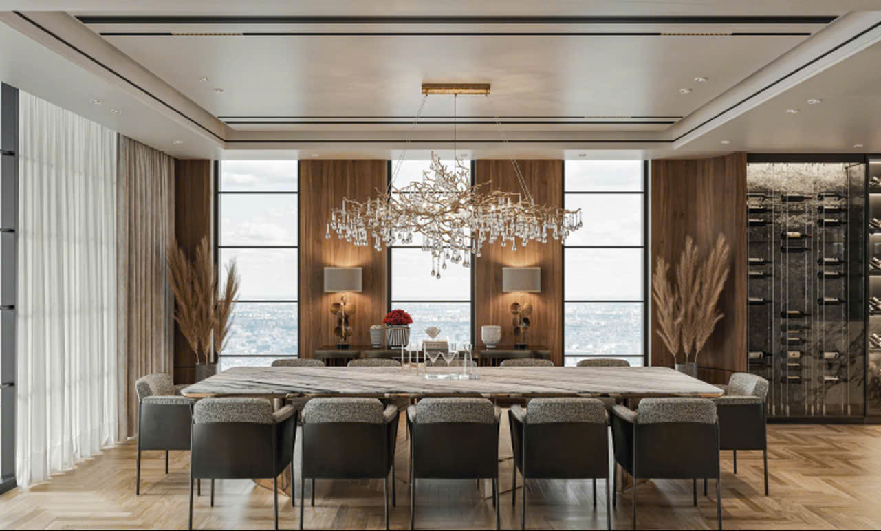 Không gian phòng ăn là nơi gia đình thường sum họp mỗi tối, mang trong mình nét thanh lịch, trầm ấm, thiết kế tầm nhìn rộng mở ra bên ngoài giúp gia chủ tái tạo nguồn năng lượng tích cực.